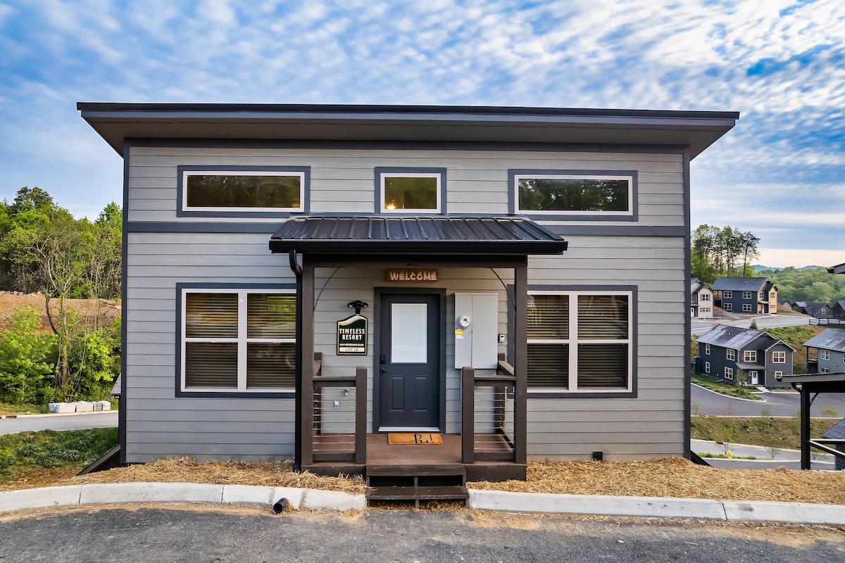 "The Bluebird" - a tiny home style cabin w/ huge amenities and modern flair in the heart of Pigeon Forge 5 minutes to the pkwy/ 7 to "the Island." Located in the tiny cabin village "The Summit at Ridge Top" comprised of 5 other tiny cabins w/ privacy built into ea cabin. Huge views of Mount Leconte & the Smoky Mtns. Fire pit. Hot tub & Swings under a covered porch off the back. 1 Bd/1 ba. Eat in full kitchen with breakfast bar/workspace. Fireplace. Convenience. Style. Cozy. In the heart of PF.