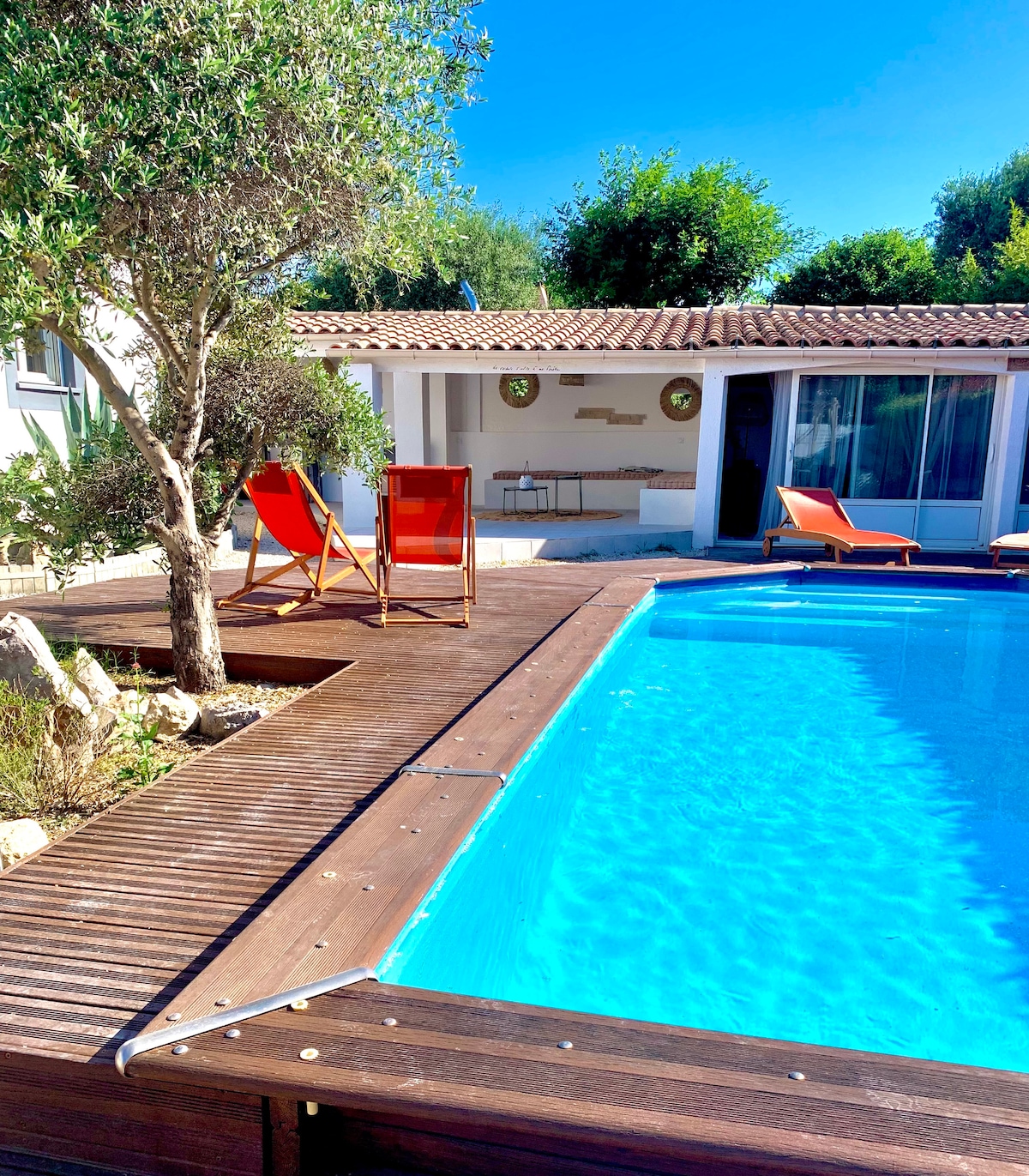 Maison de 42m² avec son jardin privatif de 100m² et 2 terrasses avec four a PIZZA. Une piscine privative de 10m² chauffée donnant sur la terrasse vous est réservée sur le terrain ( sans contrainte d'horaire pour l'utilisation) , un jardin méditerranéen est présent avec palmier, cocotier, citronnier, bananier et olivier. La maison comporte une cuisine américaine complète ( frigo, plaque à induction, fours , lave vaisselle, machine à cafés tassimo…) d’une table et 4 chaises.
