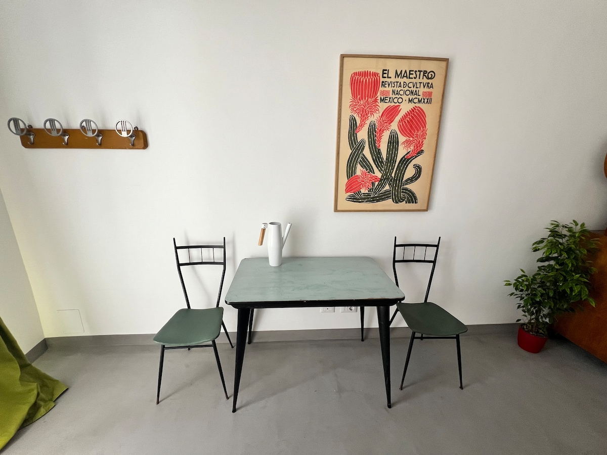 Located in the historic Pantanella Pasta Factory, this apartment is an eclectic and industrially designed open space, adorned with antique furniture, featuring a fully equipped kitchen, two double bedrooms, and a spacious bathroom with a double shower and sink. The terrace offers an escape from the hustle and bustle of the city and provides a relaxing oasis after a long day of sightseeing. Nearby: Basilica of San Giovanni, Scala Santa, the trendy Pigneto district, and the Termini train station.