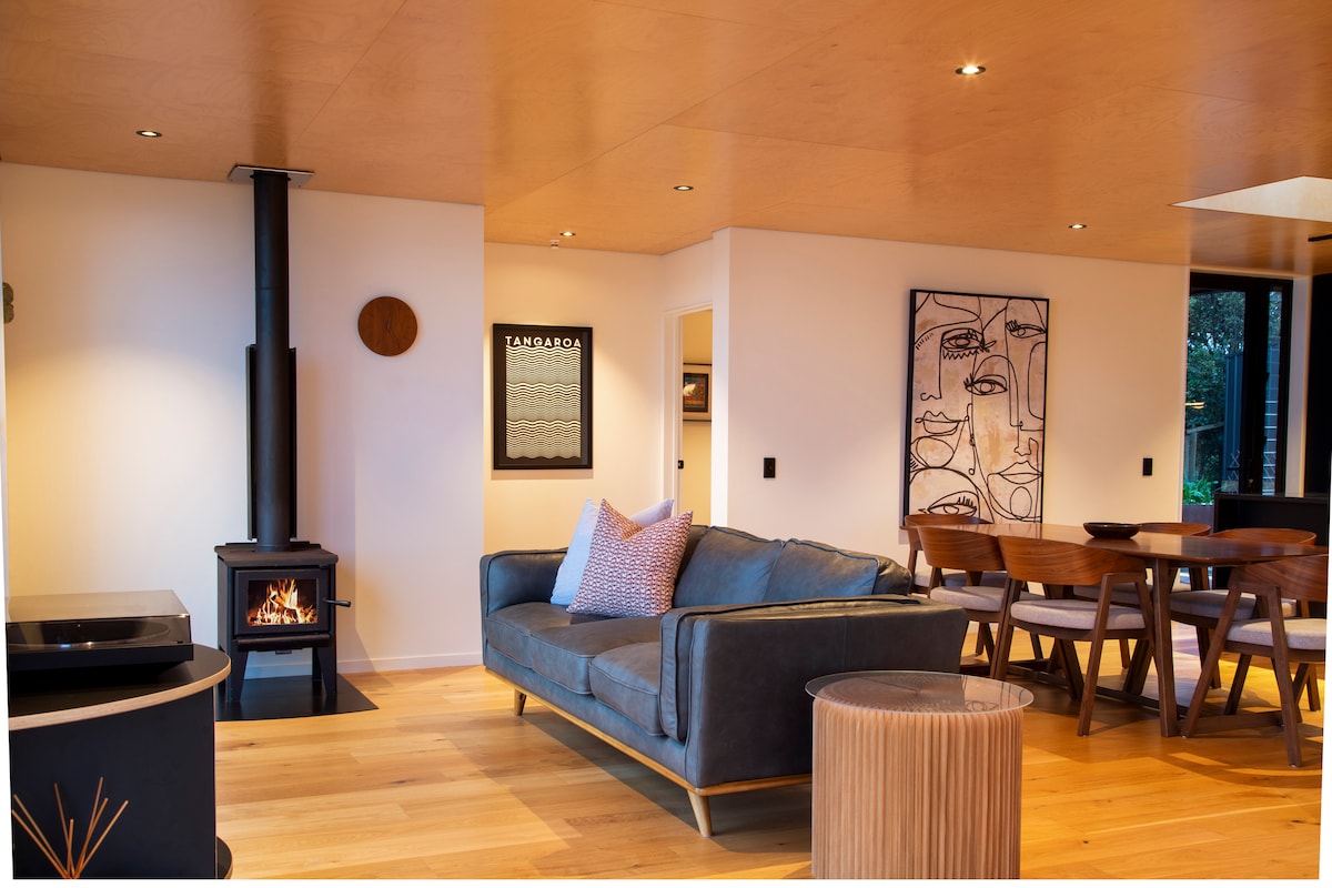 Designed to capture the sun and the sweeping ocean view. Wood-burner for cosy winter nights and unlimited fibre broadband wifi for Netflix. Pull back the ranch sliders in summer and open the house to the outdoors. Relax with dinner, drinks and the setting sun on the covered outdoor deck. Underfloor heating the bathrooms provides all year comfort. It's a 5min walk down the road to the start of the beach track and then a 20min stroll through the bush down to the beach (or a 3min drive!)