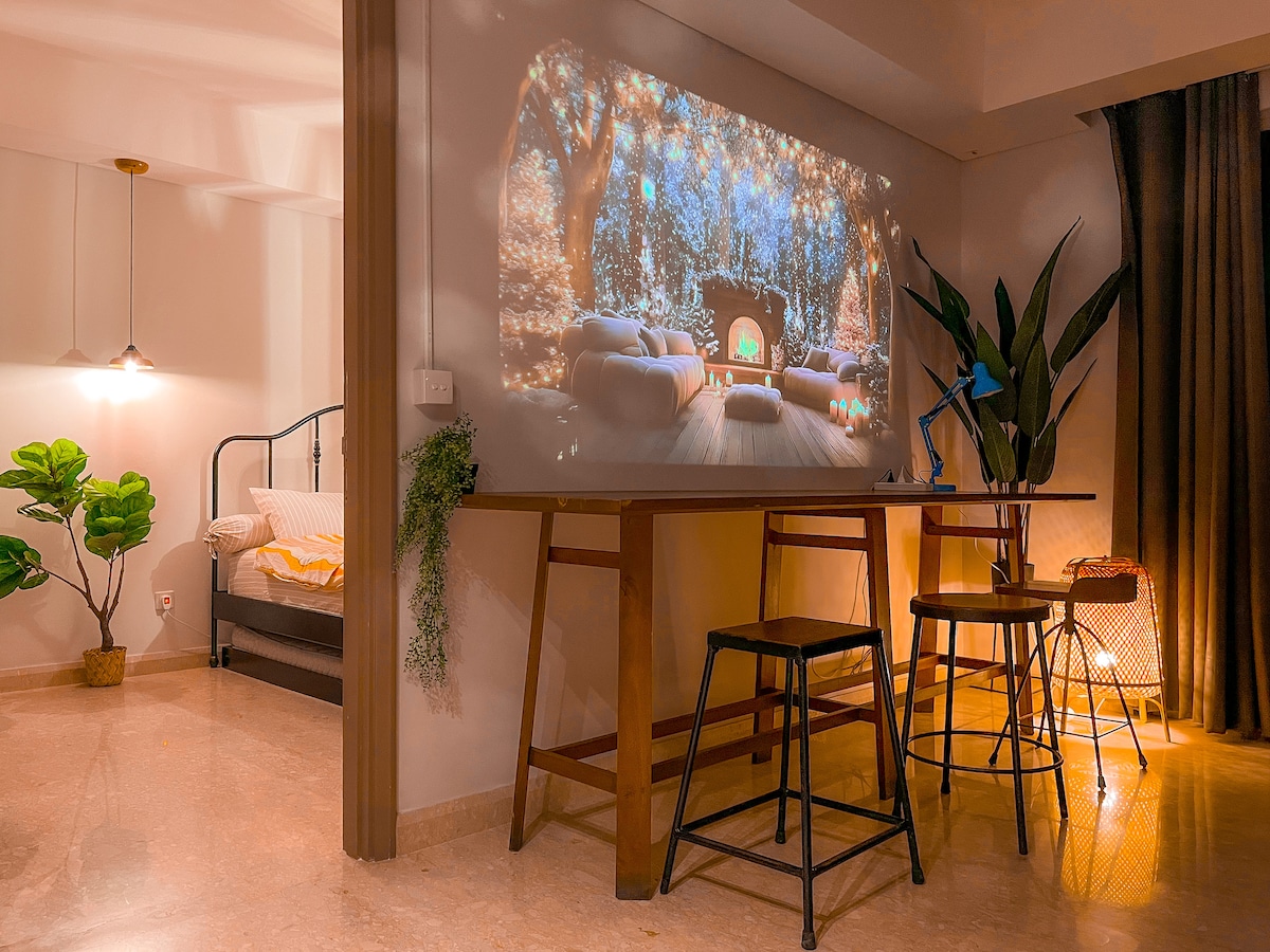 Welcome to Whimsical Room 🌿, where you and your folks can dive deep into the storytelling world 🍄, starting with: 🥐 Greetings by warm bakery at doorstep 🍳 Cook in the steamy hot kitchen 🍿 Binge watch some movies on Netflix or Disney Hotstar with the mini theater, or 🎹 Work while listening to soothing Ghibli music on Youtube 🍋🟩 Sleep soundly in floral tale bedroom 🪼 Shower in oceanic bathroom