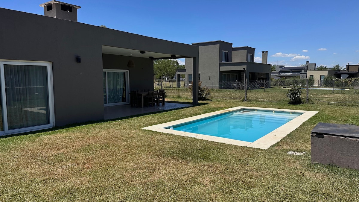 Single-story house, bright and functional, perfect for relaxing. Located in the exclusive gated community of Tessalia, in the heart of Argentina's polo region, Paraje Ellerstina, and just 50 minutes from Buenos Aires. The house features over 1,000 m² of private garden, an organic vegetable garden, a compost bin, fiber optic Wi-Fi, air conditioning in every room, and linens included. Pet-friendly: we welcome dogs! Follow us on @casaaguaribay