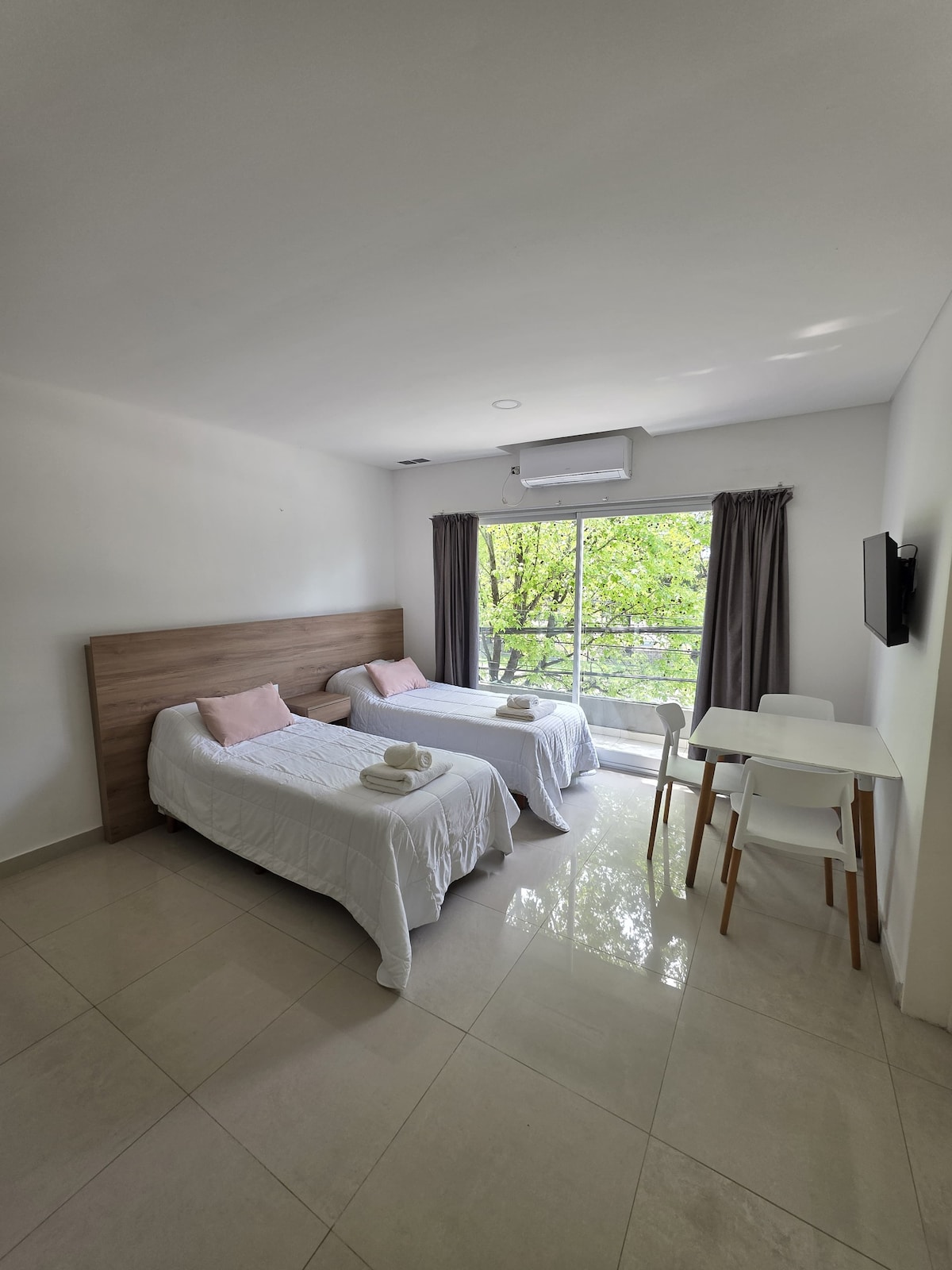 Es un estudio que cuenta con una cama doble y una single, un baño completo (con calentador de toallas, ideal para invierno). Tiene cocina abierta totalmente equipada con heladera, microondas (a convección, sustituye el horno tradicional), jarra térnica, tostadora, cafeteria eléctrica y licuadora. El departamento cuenta con aire acondicionado frio calor y un LED TV de 43" Los amenities del complejo hacen que sea un lugar único. Ideal para descansar y disfrutarlo todo el año. 10’ d Pilar centro