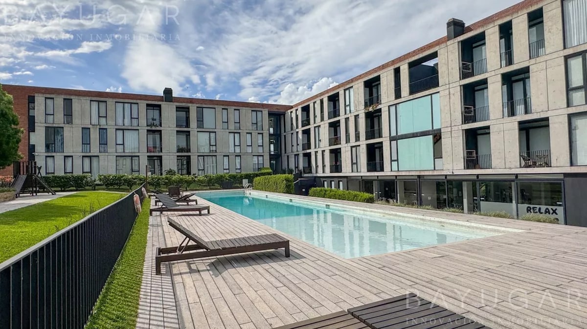 The residential complex Campus Vista has 24-7 private security, a sauna, a heated indoor pool, outdoor pool, fully equipped gym, fire pit, terrace with panoramic views, covered parking spot. It features: queen bed, sofa bed, spacious private terrace with a fire pit with a grill, a covered parking spot. Immerse yourself in a relaxing experience located in Pilar, in front of the Austral Campus and 300 meters from its entrance. It's an 8' walk or a 2' drive to the IAE and Hospital Austral.