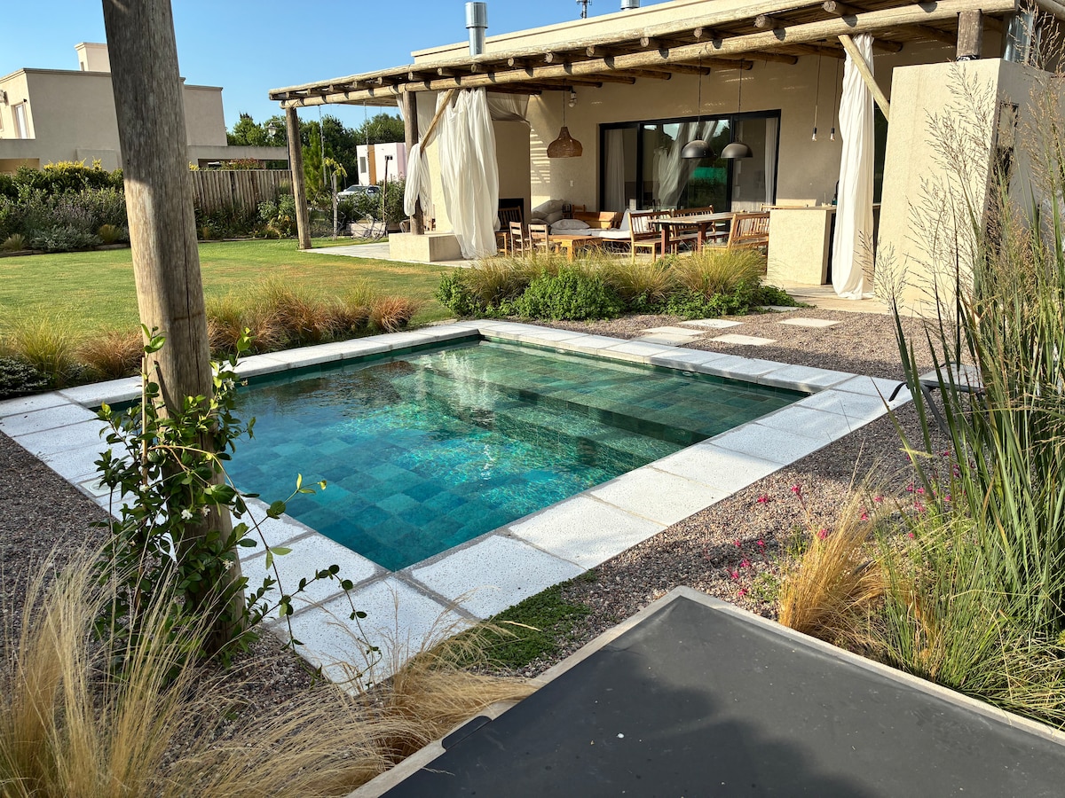 Alojamiento de diseño, único y tranquilo. Vas a poder relajarte en nuestro jardín con una hermosa piscina, contemplarla desde el living o la galería. Preparar tus comidas favoritas en una super cocina o jugar o mirar TV en un lindo play-room. Ubicada en el exclusivo barrio de Golfers, donde encontrarás las mejores arboledas y la combinación perfecta de tranquilidad y deporte: tenis, pádel, golf, polo, fútbol ¡y mucho más!