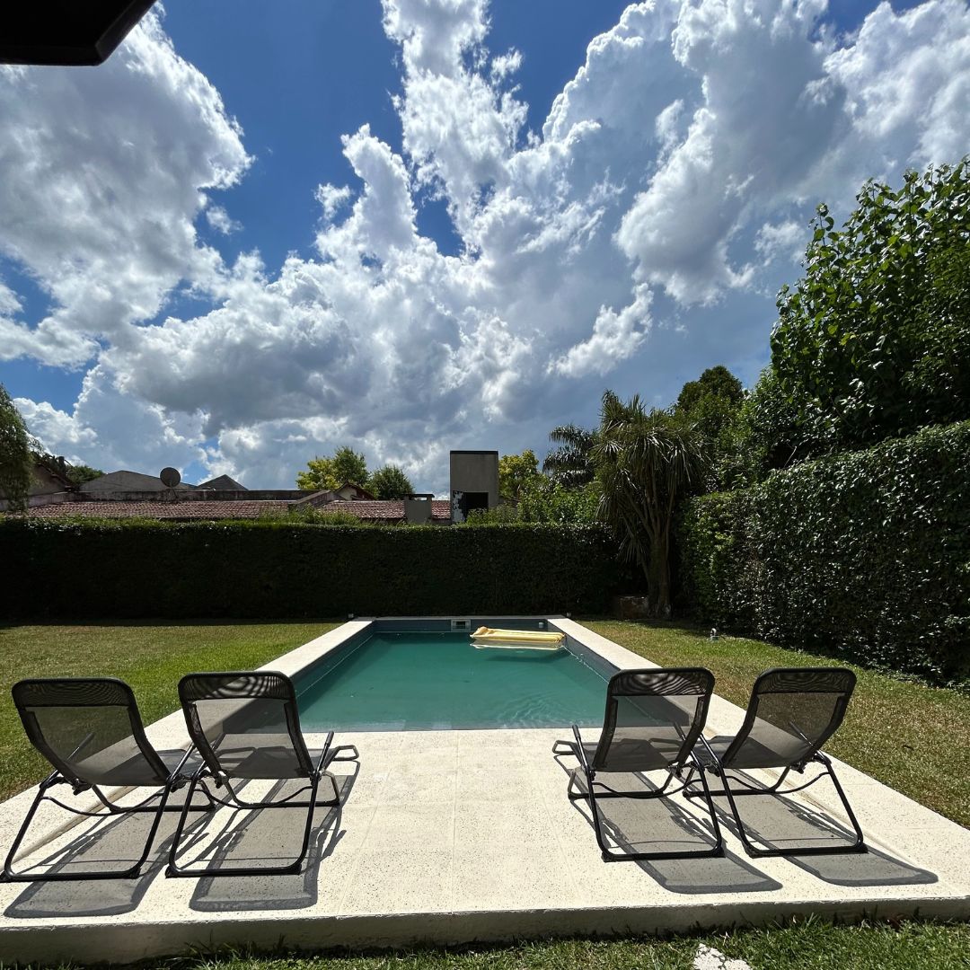 Beautiful, single-storey house with three bedrooms, one in suite, 8 beds in all, surrounded by a 4000-m2 park of pure quietness, a swimming pool and a jacuzzi, and the security offered by La Retama country club in the district of Manzanares, Buenos Aires, and only a few blocks away of supermarkets and the train station. It features a semi-covered gallery and a fully covered barbecue area next to the house, with a bathroom, change room and washing room. And all the comfort of a operative home.