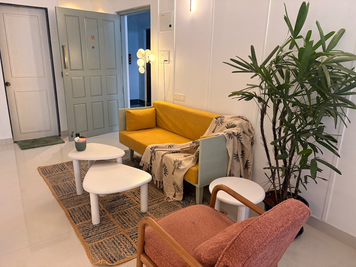 Imagine entering a modern & thoughtfully designed apartment with lush edible balcony gardens that you share with birds & squirrels. Located in Siolim Marna, this 1BHK is designed for couples, solo travelers & offbeat families on a short vacation, a longer workation or a peaceful retreat. We love all things design and DIY. Every piece of furniture has been upcycled and we've tried to think of everything you might need- wifi on backup, a bar, an equipped kitchen, a swing, books & art supplies!