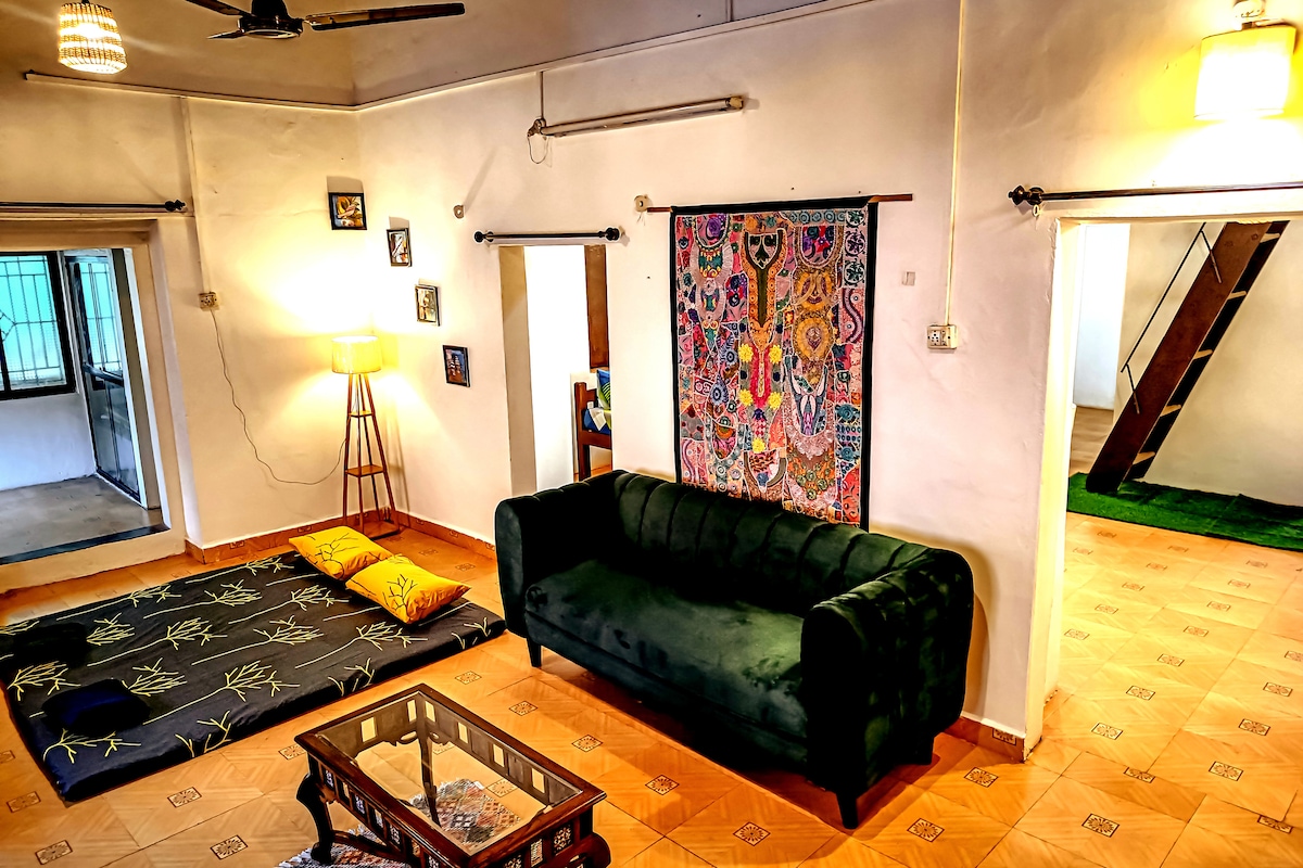 Certified by Goa Tourism 950 sq ft air-conditioned apartment: 2 bedrooms, 2 bathrooms, TV/living room, open kitchen; laundry nook + 500 sq ft non-air-conditioned space: dining for 4; sunroom sit-out; shaded patio; open-air balcony 300mbps internet; 4-5hr power backup; 50" Smart TV; books; board games; workstation & covered car park Located in Porvorim: 15min Panaji/Mapusa; 25min Calangute/Baga; 30 min Anjuna/Vagator; 45-60min Ashvem/Mandrem/Arambol; 60-75 min South Goa beaches; 120min Palolem