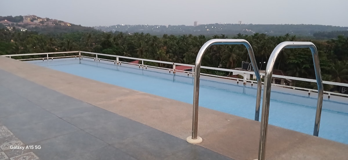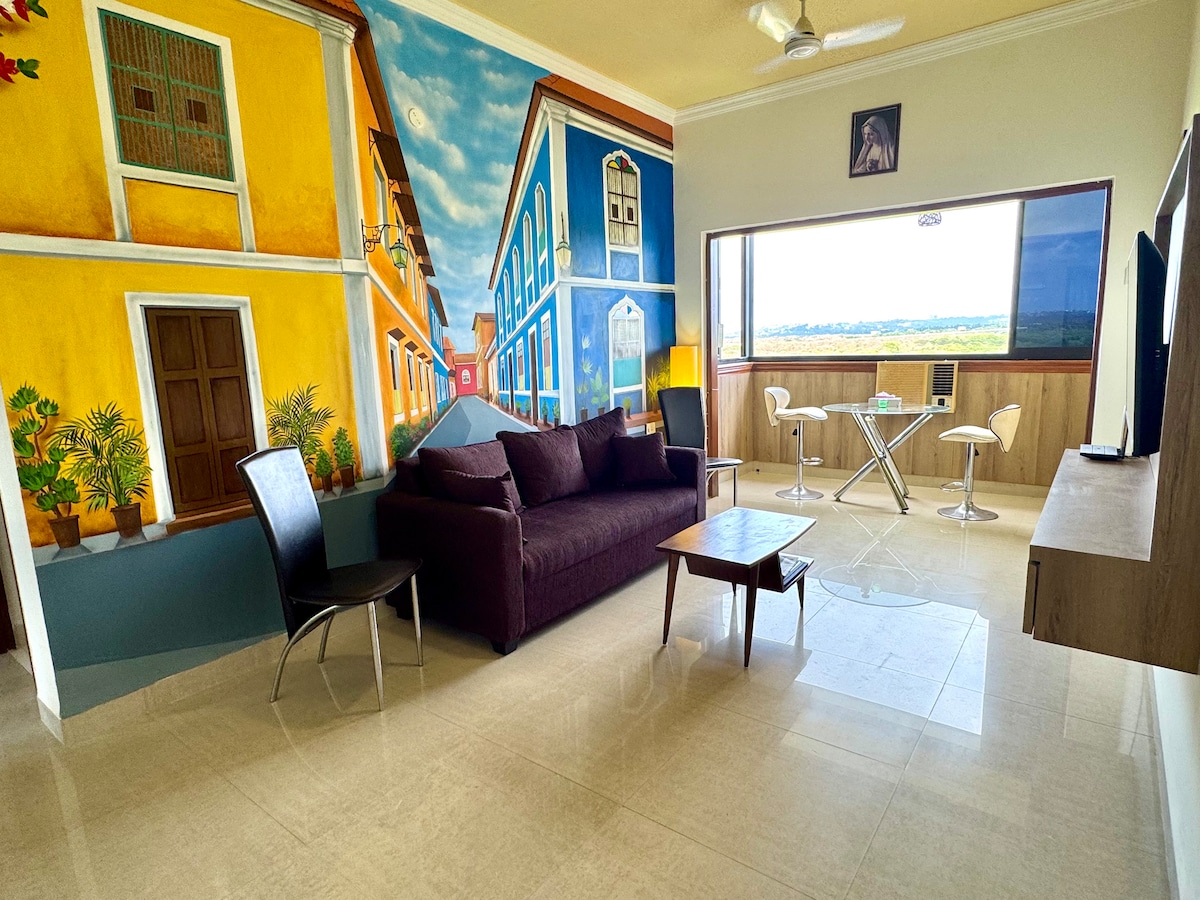◆Just 4.4 km from Candolim Beach. ◆Rooftop pool, cosy gazebo & stunning views – perfect for relaxing evenings. ◆Bedroom with elegant interiors & an ensuite bathroom with a jacuzzi bathtub. ◆1-BHK apartment with balcony, perfect for a memorable Goa getaway. ◆Living room with comfy sofas, TV, private balcony & dining area. ◆Enjoy top-notch service from a 5-star hospitality team with the spirit of “Atithi Devo Bhava”