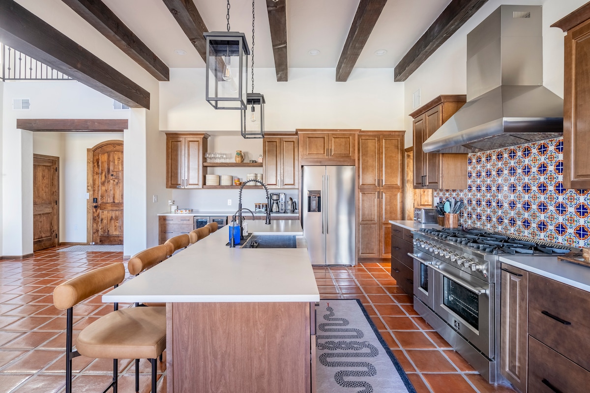 Welcome to the Owl House, a resort-like desert retreat built in classic hacienda style with modern touches and comforts and a splash of southwest. With wood beams throughout, twenty-five foot wood paneled ceilings in the entry zaguan, an iron chandelier, classic saltillo floors and Spanish talavera tiles, it will feel as if you are stepping back in time, but yet you'll be surrounded by modern luxurious amenities like a knife edge pool and hot tub, fire pit, and 48-inch stove.