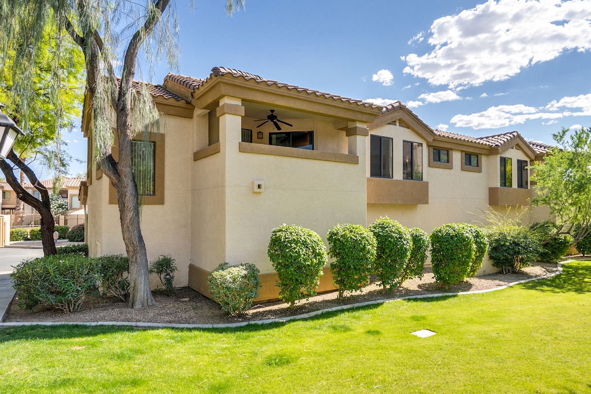 Private outdoor paradise with Heatable Pool and Spa. Covered patio with outdoor furniture and shade umbrella provided. Beautiful flowering landscape. Backs up to the De Anza Trail and Riparian Preserve, great for hikes, birdwatching and biking. Home has great Mtn Views. Sleeps up to 5. Premier cable TV with fast internet. Super clean w/cozy gas fireplace, plantation shutters, garden tub in master with separate shower and more. PETS only allowed with written approval and paid fees/deposits.