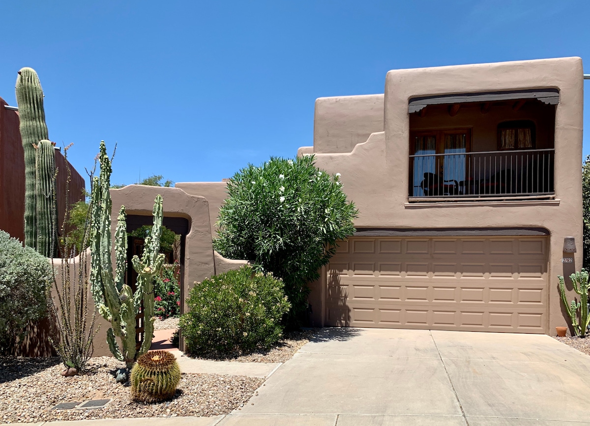 The home is a classic adobe style 3 Bedroom 2.5 Bathroom with beautiful exposed wooden log ceilings in the living room, custom saguaro rib shutters & traditional saltillo tile floors. Enjoy all the comforts of home in this 1,800 square foot house with a beautiful secluded private back yard with a private pool & hot tub. Enjoy the peace & birdsong. The house is fully equipped with everything you will need for your stay, close to restaurants, shops, Golf & all the outdoor adventure you can imagine