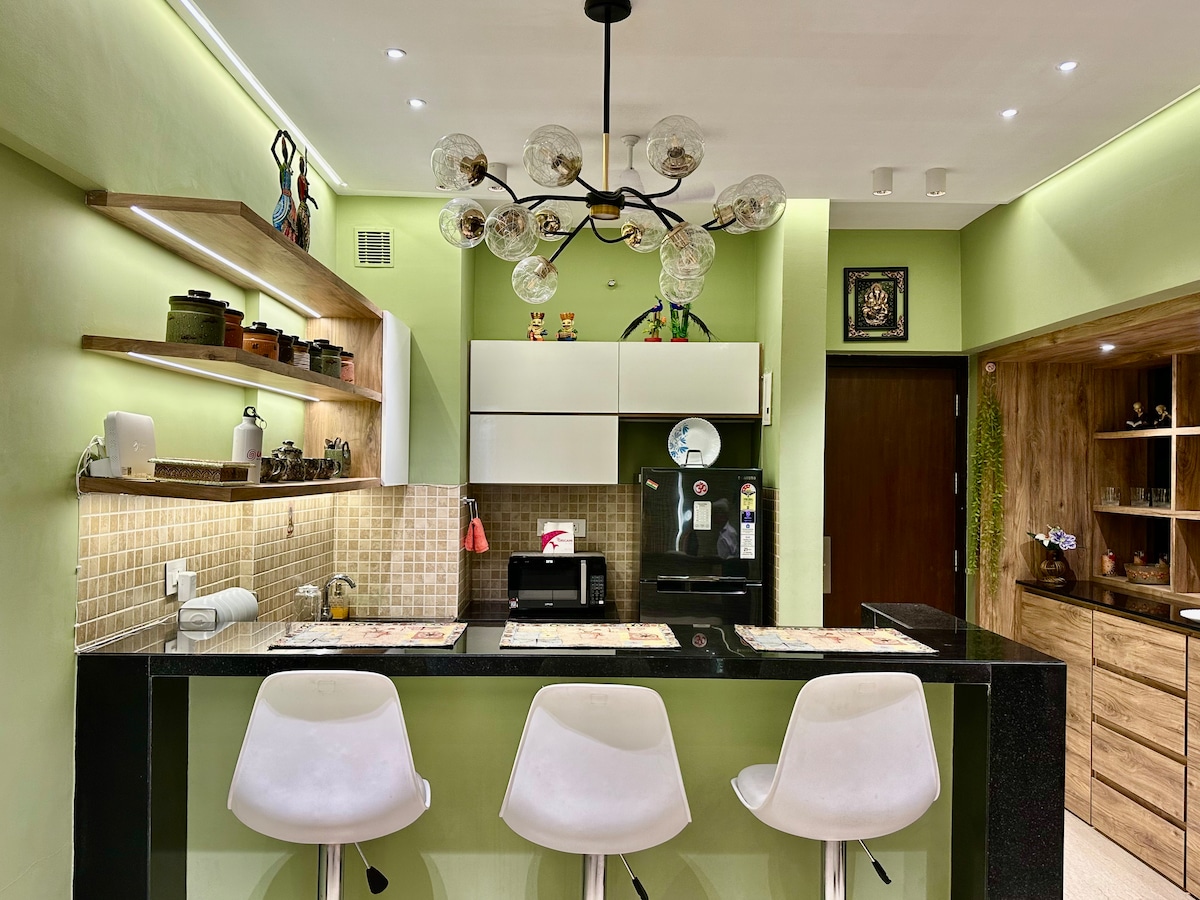 Step into 404 Luxe Haven, a thoughtfully designed 404 sq.ft studio apartment blending modern comfort, warm lighting, and elegant interiors. Featuring a signature mustard velvet sofa, a cozy queen bed framed with floral backlighting, a stylish modular kitchen, and a relaxing balcony with greenery, this space is perfect for singles, couples, or business travelers. Enjoy a peaceful ambiance with contemporary décor, soft neutral tones, and every essential curated for a seamless stay.