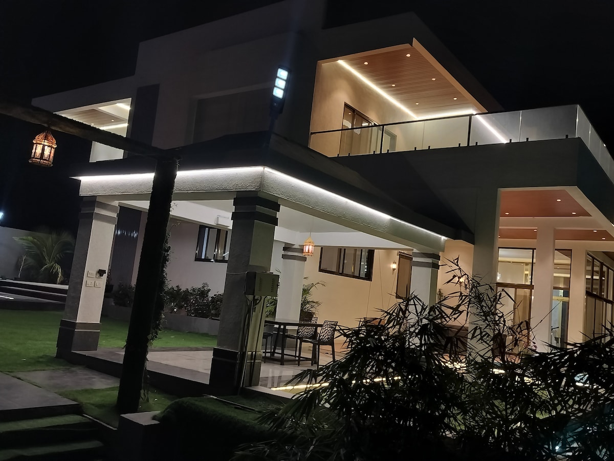 Tucked away amidst lush farmland in Talegaon, SkyGram Solace is your perfect countryside escape where comfort meets calm. This spacious 3BHK villa is designed to offer a serene and luxurious stay, complete with a private pool, lush garden, and a dedicated kids' play area, making it ideal for families and groups. With its generous indoor and outdoor spaces, SkyGram Solace comfortably accommodates up to 15 guests.