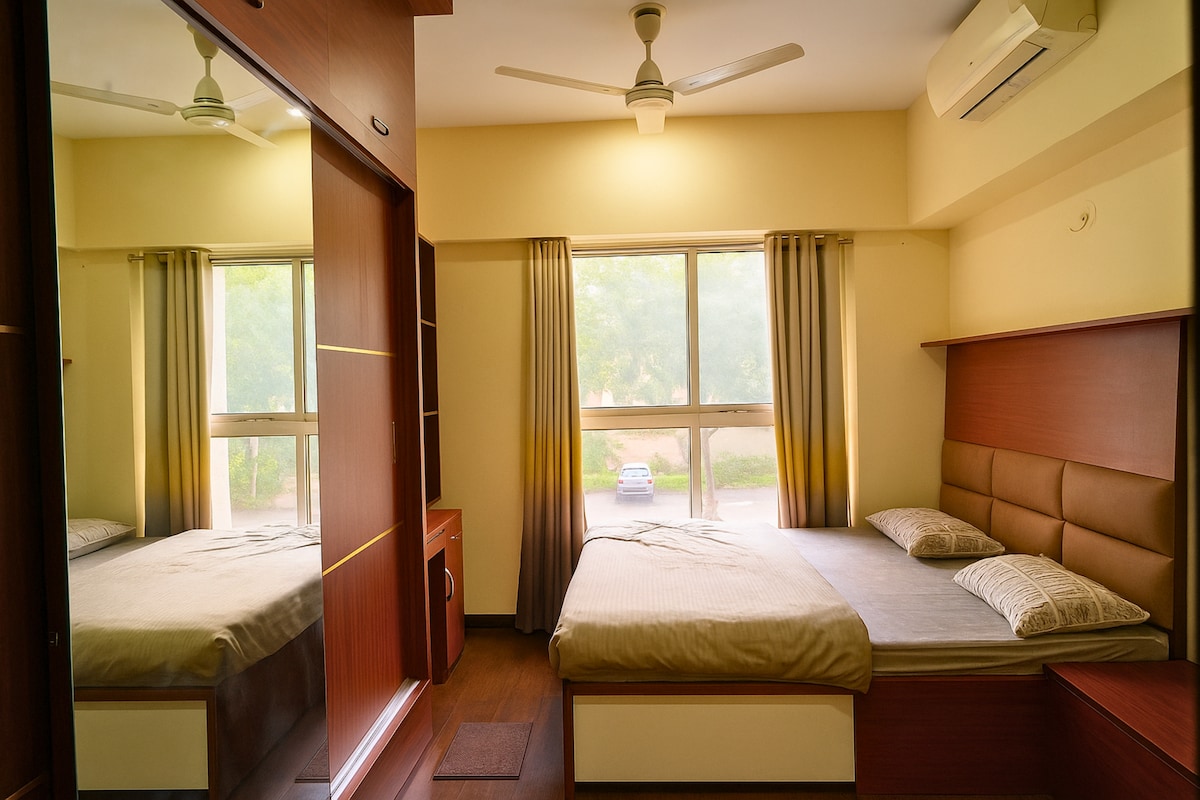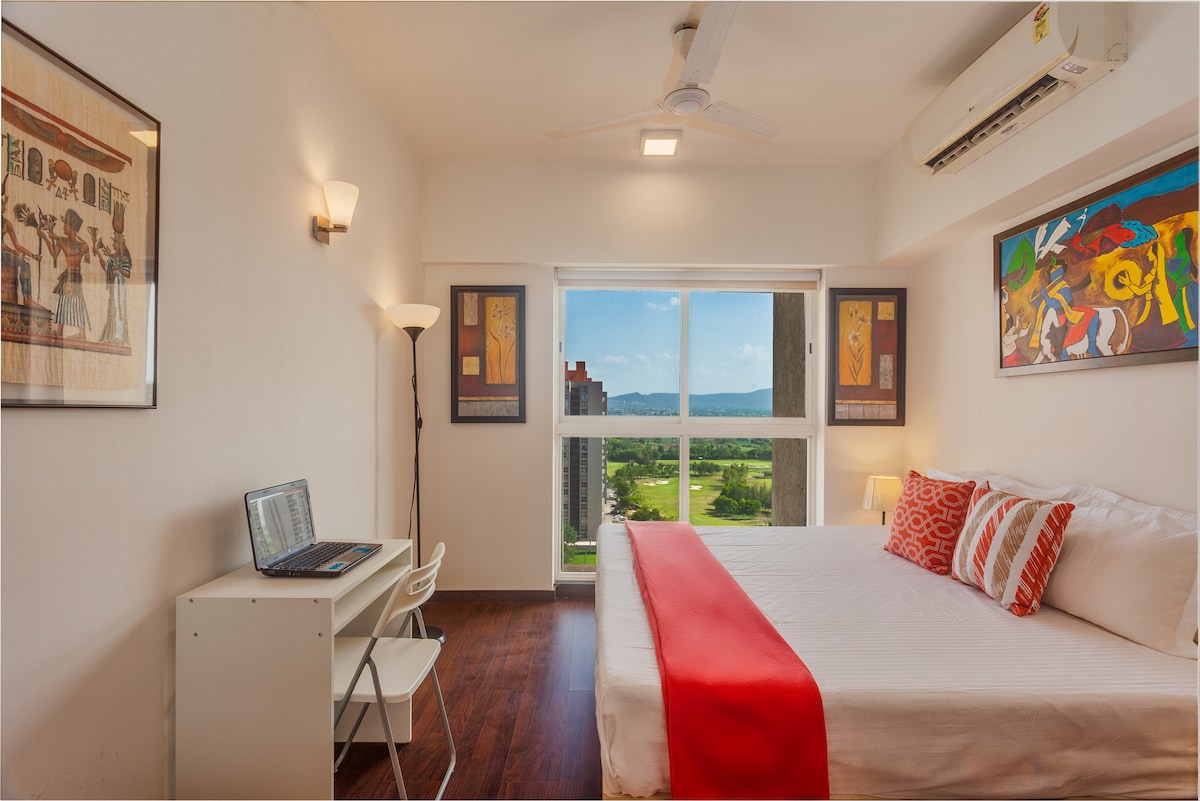 Welcome to a calm and comfortable 1BHK studio ideal for couples, families, solo travelers, friends, and remote workers. Whether you’re here for a quiet weekend, a work-from-home stay, or a longer peaceful break, this home offers the right balance of comfort, greenery, and convenience. The private balcony overlooks lush green surroundings near the golf course. With fast WiFi, OTT apps, and a quiet gated environment, it’s easy to slow down and feel at home.