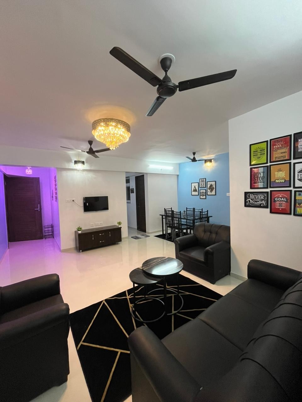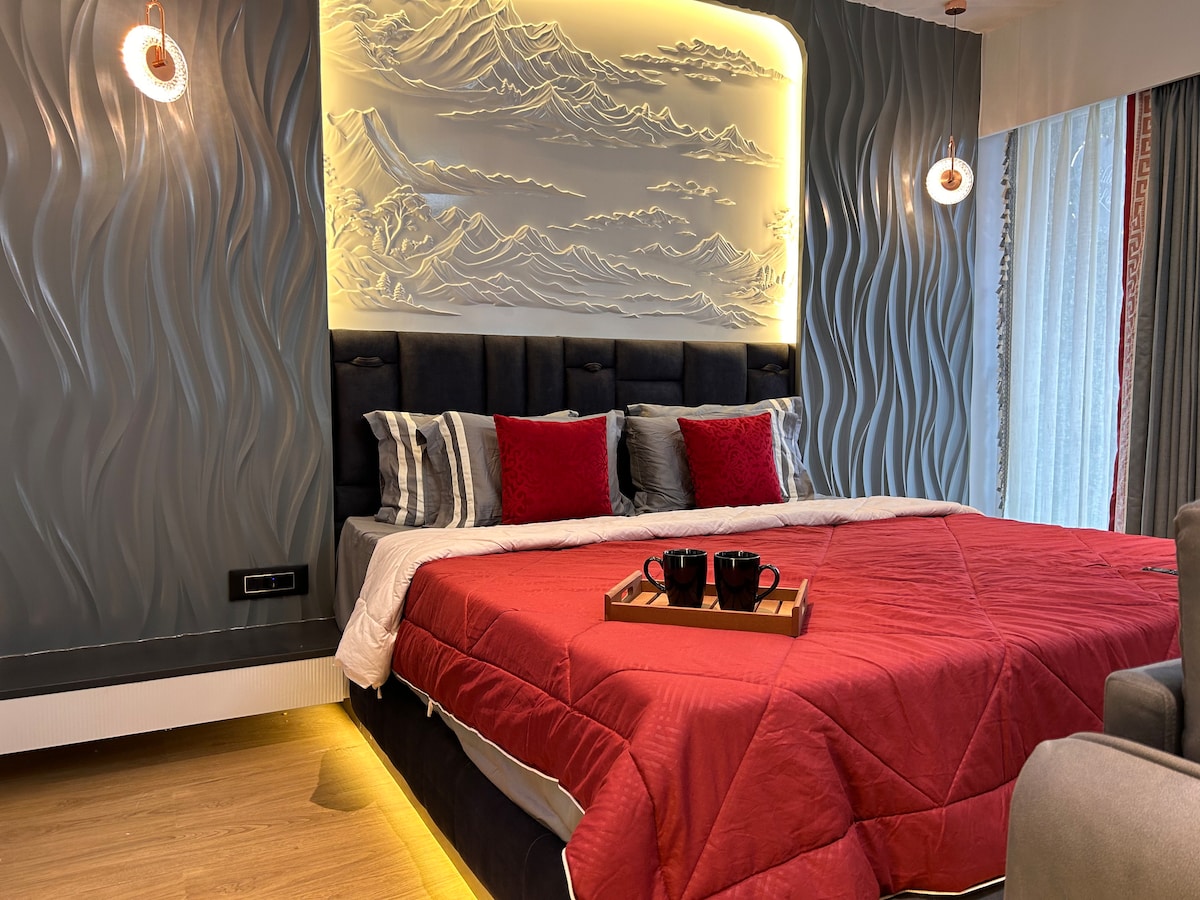 StayBird - Divine Suiites, where Family comfort meets modern luxury in our Premium 1 Bedroom Family Apartment. Spread out and relax in style with ample space including a cozy living area, 2 balconies offering scenic views, kitchenette for your convenience. Enjoy entertainment with two TVs and gather around the dining table. Unwind on the comfortable sofa after a day of exploring Pune's attractions. Perfect for families or groups, We offer a comfortable retreat in the heart of Kharadi.