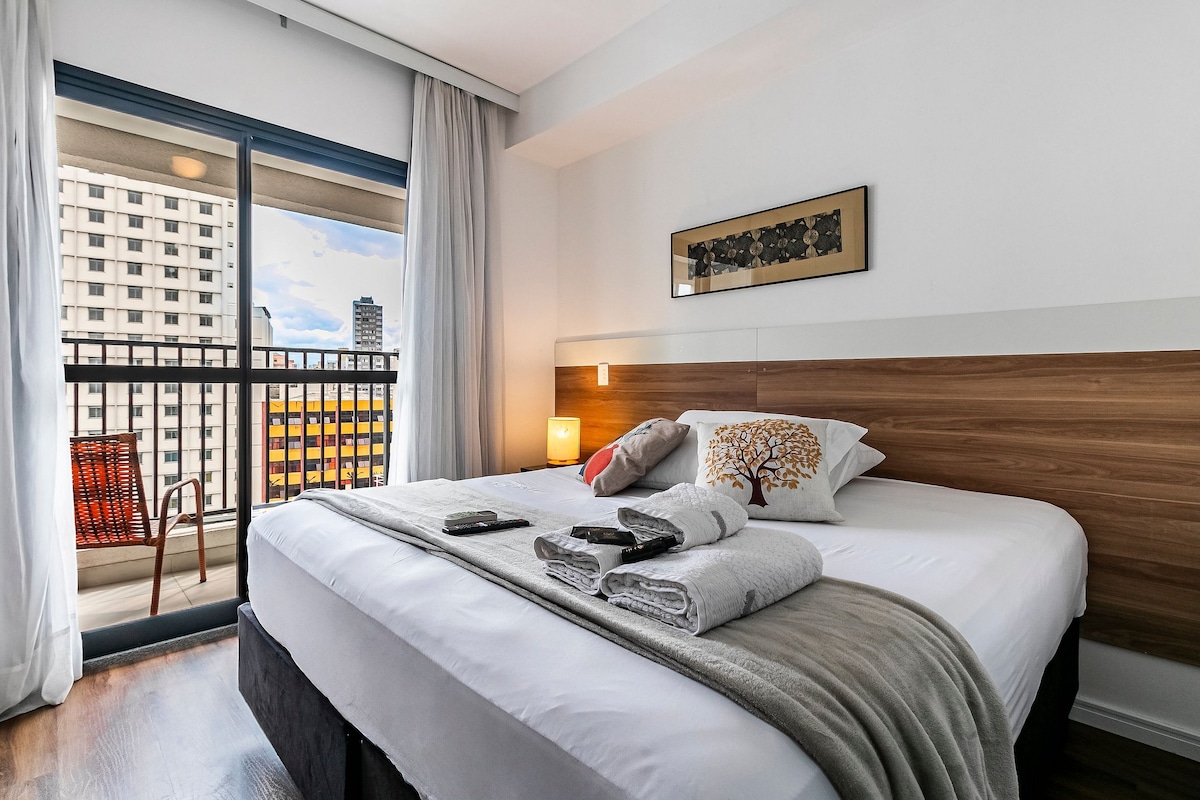 Penthouse with balcony, loft type. Ideal for enjoying or working. Well ventilated and quiet. Cozy, beautiful, with stunning views from the 19th floor. Well-appointed: living room (air conditioning, WI-FI, smart TV 49 , large table), balcony (portable barbecue, coffee table), full kitchen and laundry. Charming, leafy and lively neighborhood, with a wide variety of shops, services and leisure. Santa Cecília Metro two blocks away. Concierge and garage with valet 24 hrs.