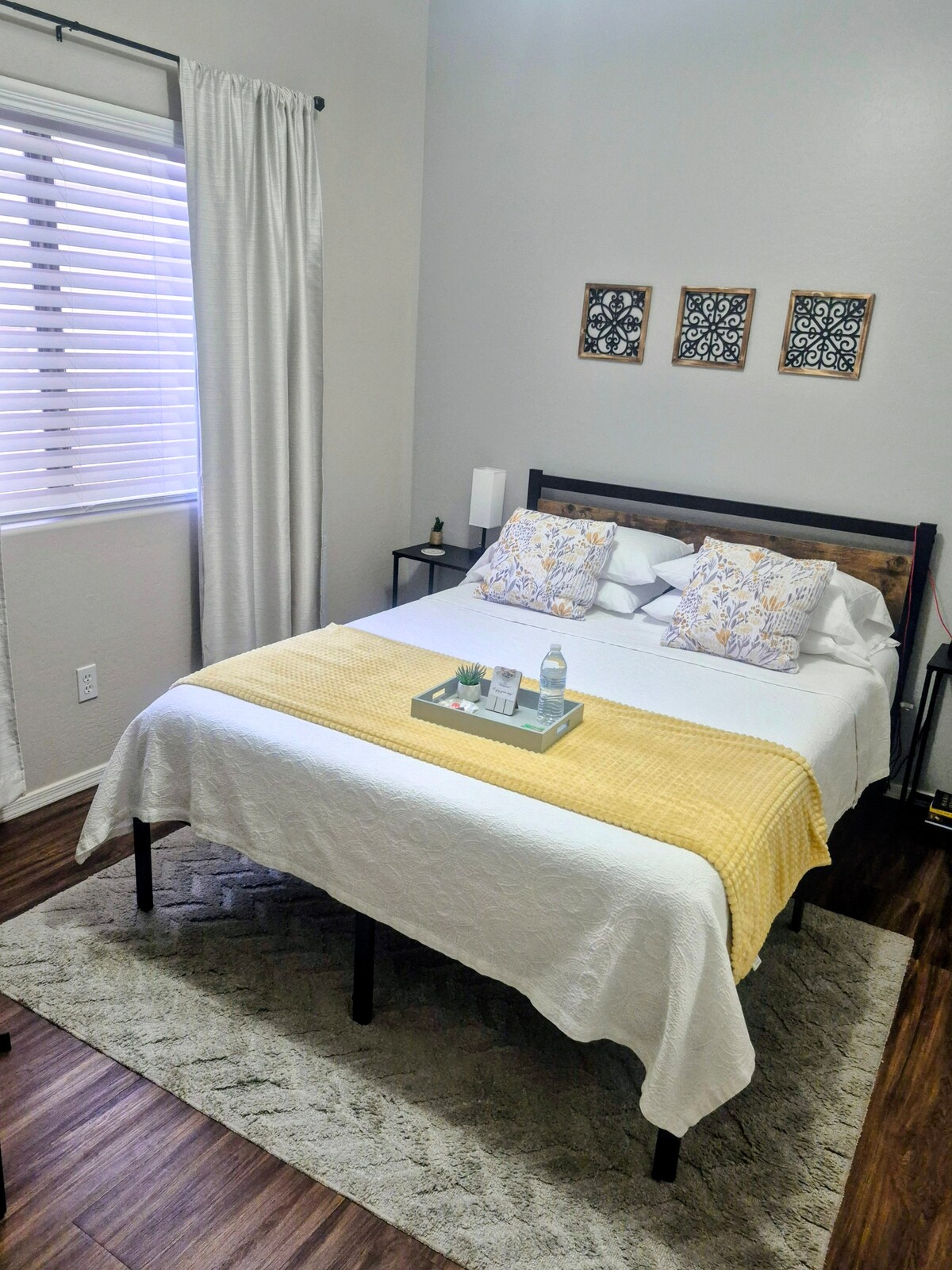 Enjoy our newly remodeled and professionally designed 1 bed, 1 bath private guesthouse. The stylish and cozy suite includes a full kitchen with brand new appliances, a work space, living room, and bedroom with a closet and ensuite bathroom. It is located just 15 mins away from major destinations, such as ASU, Sky Harbor International Airport, and fun attractions. We offer free parking on the property, in addition to wi-fi, Roku TV and toiletries. We would love to host you!