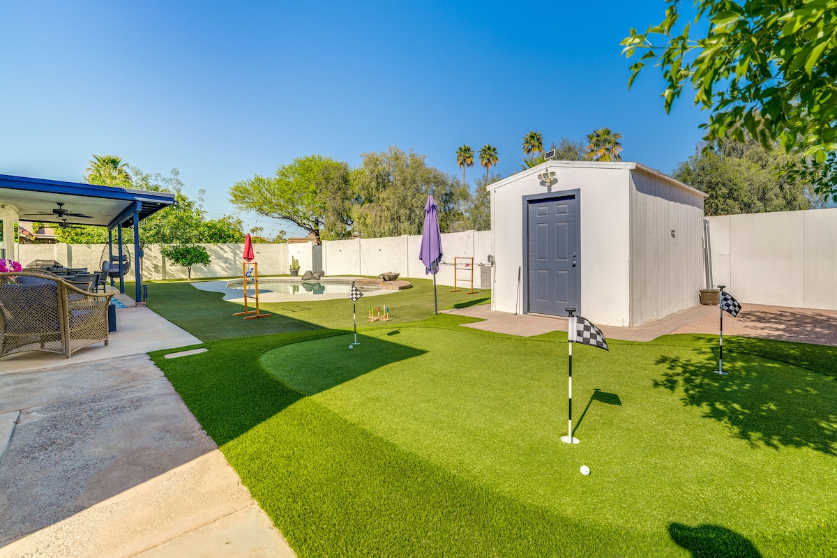 Jump into a 5 Person Hydrotherapy Hot Tub or a deep retro private pool (not heated), grill steaks at this bright Scottsdale home. Experience a blissful retreat with a thoughtfully decorated interior, boutique furnishings, covered outdoor dining. Work remotely. Old Town Scottsdale and Mill Avenue, Sky Harbor Airport, Golf course, Frisbee Golf, Baseball restaurants and Scottsdale Green Belt *High speed WIFI 500mg *3" mattress toppers *Cotton sheets, Pottery Barn duvets *Pool Basketball *King Bed