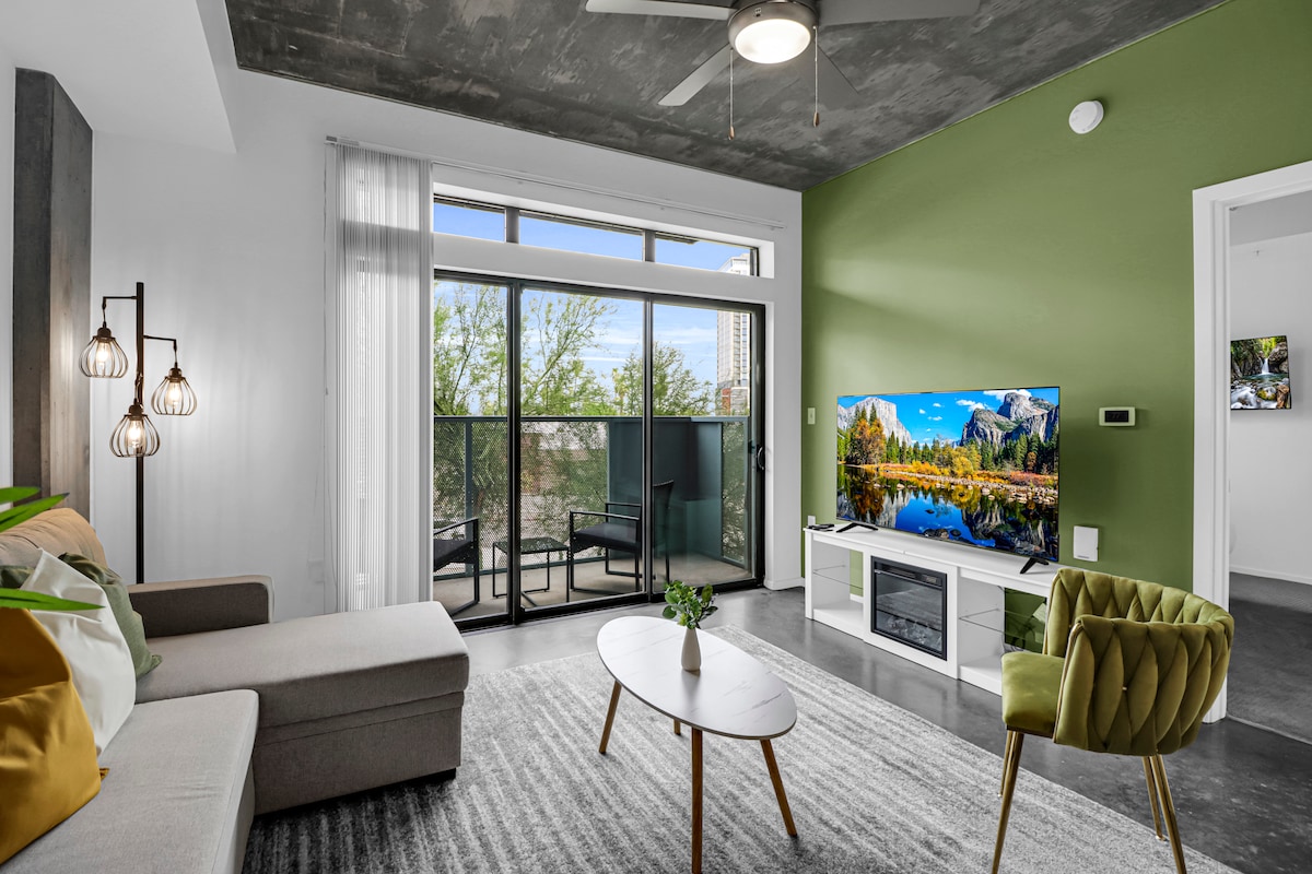 Enjoy your time at this one bedroom modern condo with vaulted ceilings, features like a color changing fireplace & private patio. The kitchen appliances are all new and we included an air-fryer and the fridge has filtered water & ice. The bed is a Queen size Dream Cloud and there is a queen airbed for guests. Yes there is a washer & dryer in the unit with all the laundry needs. Your pool is just steps away so we have included pool floats, beach towels, a speaker and a small ice chest for drinks.