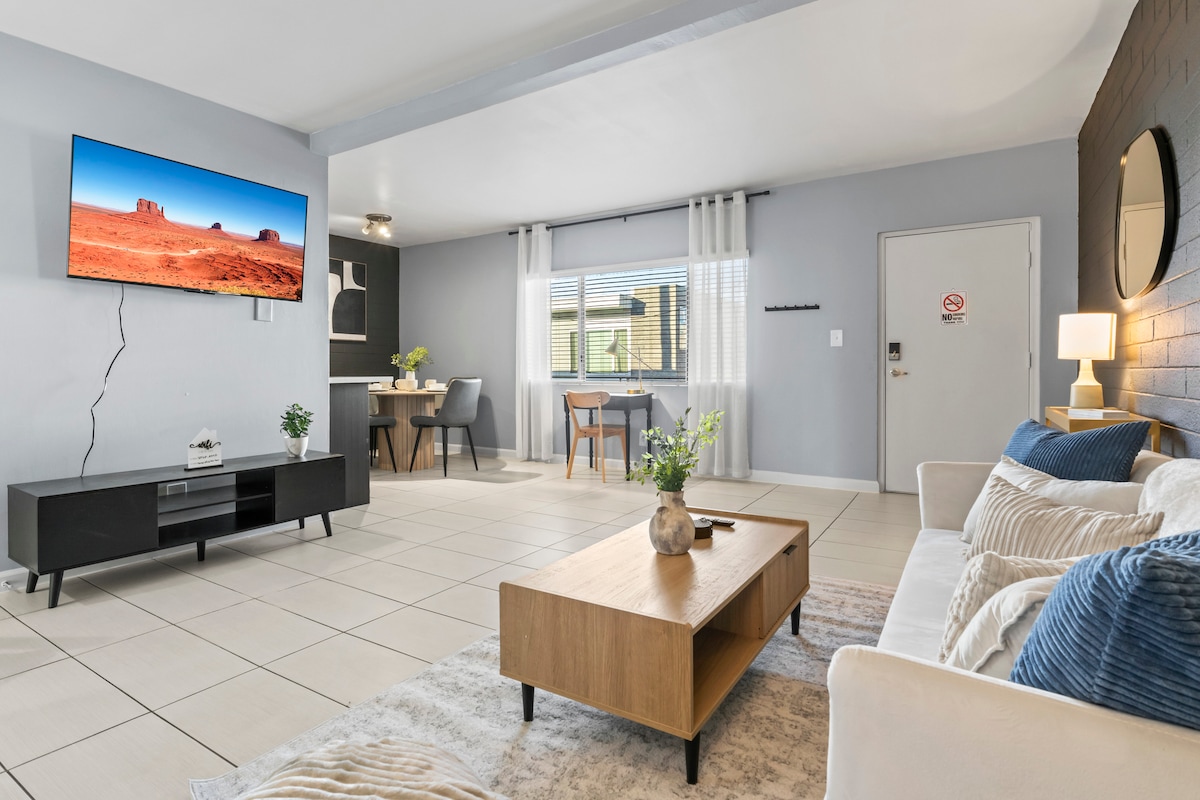Welcome to our 1 bed 1 bath apartment, in the heart of downtown Phoenix! Our apartment is perfect for solo travelers or couples looking to explore the vibrant city. Enjoy our stylish living room, fully equipped kitchen and comfortable bedroom. You'll be in a vibrant and busy neighborhood, next to all the best restaurants, bars, and attractions that Phoenix has to offer. Next to Roosevelt Row ✔ Fully Equipped Kitchen ✔ Comfortable Bedroom w/ Queen Bed ✔ Office Desk ✔ Wi-Fi ✔ Free Garage Parking