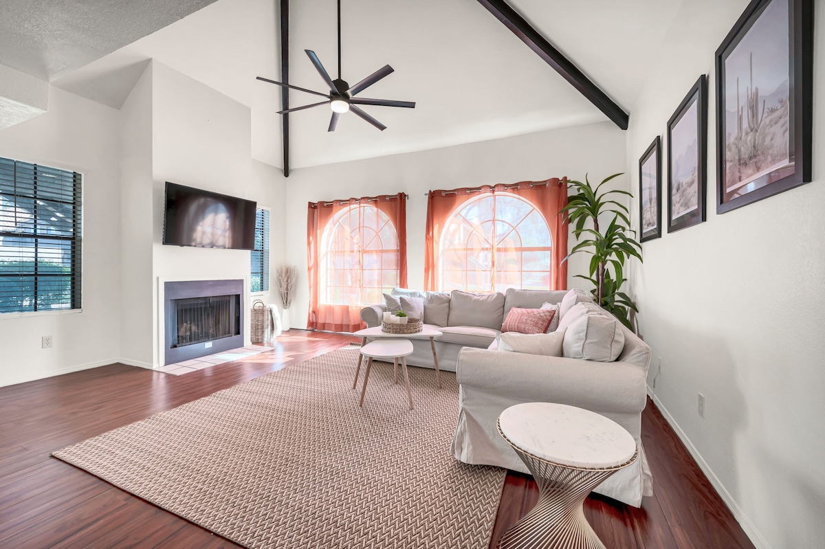 Mid-century modern meets luxurious desert living in this beautifully remodeled Tempe townhome! The Papago Pad features 2 bedrooms, 2 bathrooms and a loft that triples as a bedroom/office/coffee bar. You can look forward to a home that is peacefully situated minutes from the Papago Mountains and perfectly central to Sky Harbor Airport, Old Town, Mill Ave and ASU. Also fully remodeled with tons of amenities, a spacious turf patio and community pool! TPT License: 21381359