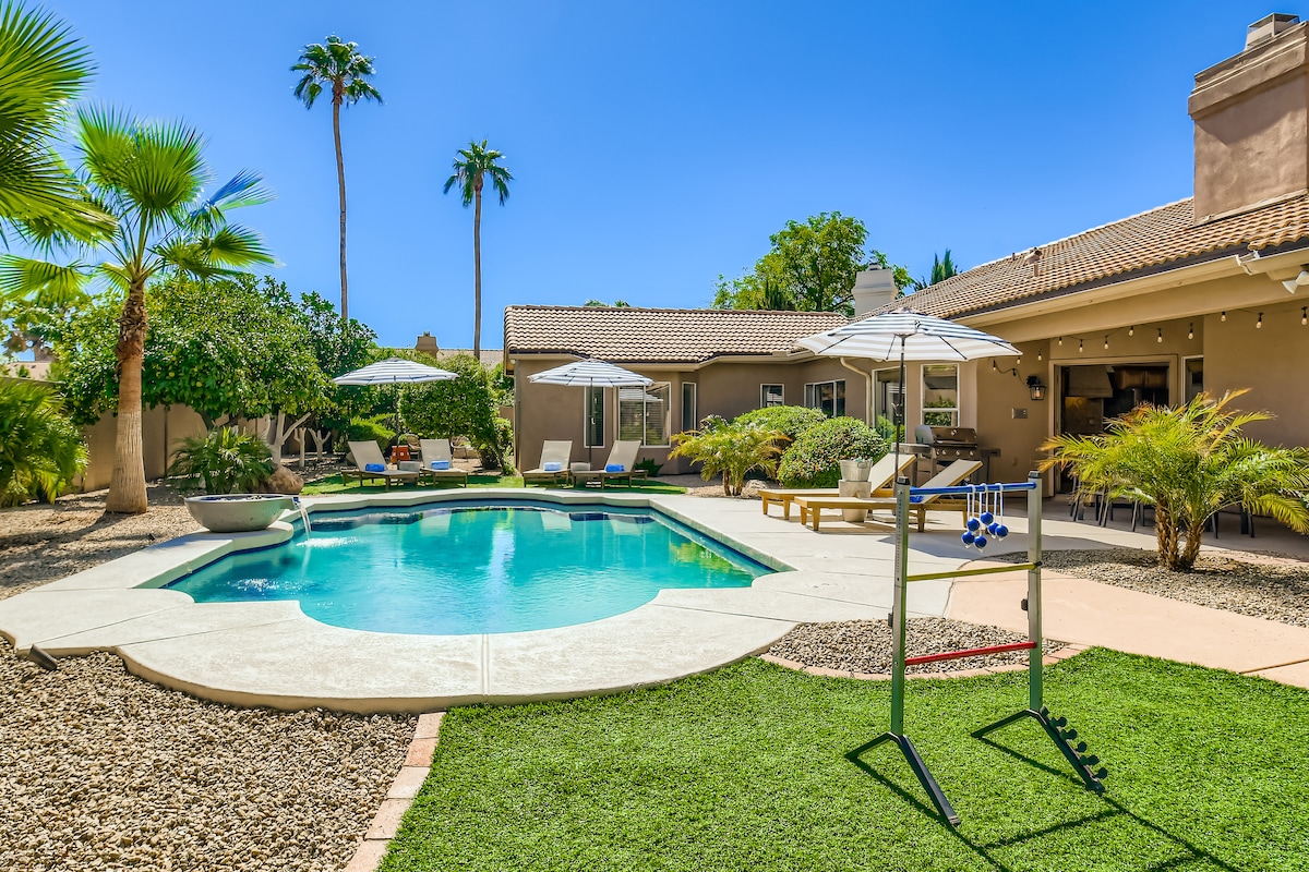 Welcome to our cozy lakefront home with private pool, hot tub, and tons of beautiful outdoor areas. This stunning Lakefront property is private resort living at it finest! A luxurious 4 bedroom home, complete with a large covered patio, tiki bar, outdoor built in grill-- it's perfect for hosting family reunions, a winter golf getaway with friends, or for a snow bird get away. Only 1 mile from Historic Downtown Chandler, and within a short drive of over 10 world class golf courses.