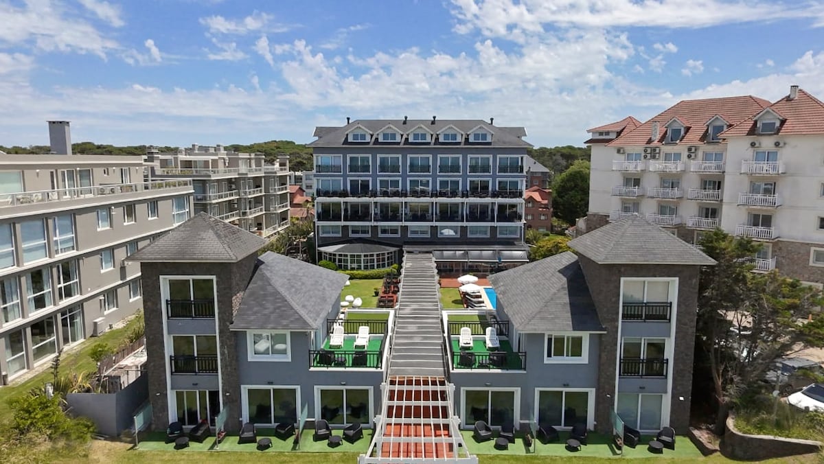 Hermoso alojamiento en Renata Norte, Pinamar. Ideal para parejas o familias con niños. Vistas impresionantes. Terraza privada de +80 m² con parrilla y jacuzzi. Amenities de lujo: piscina interior y exterior, gimnasio, spa con sauna y microcine. Seguridad 24 hs. Cochera para camioneta o auto. A 200 m de la playa y cerca de zona comercial Pinamar Norte. Rodeado de bosques, inmerso en la naturaleza y cerca del centro histórico de Pinamar.