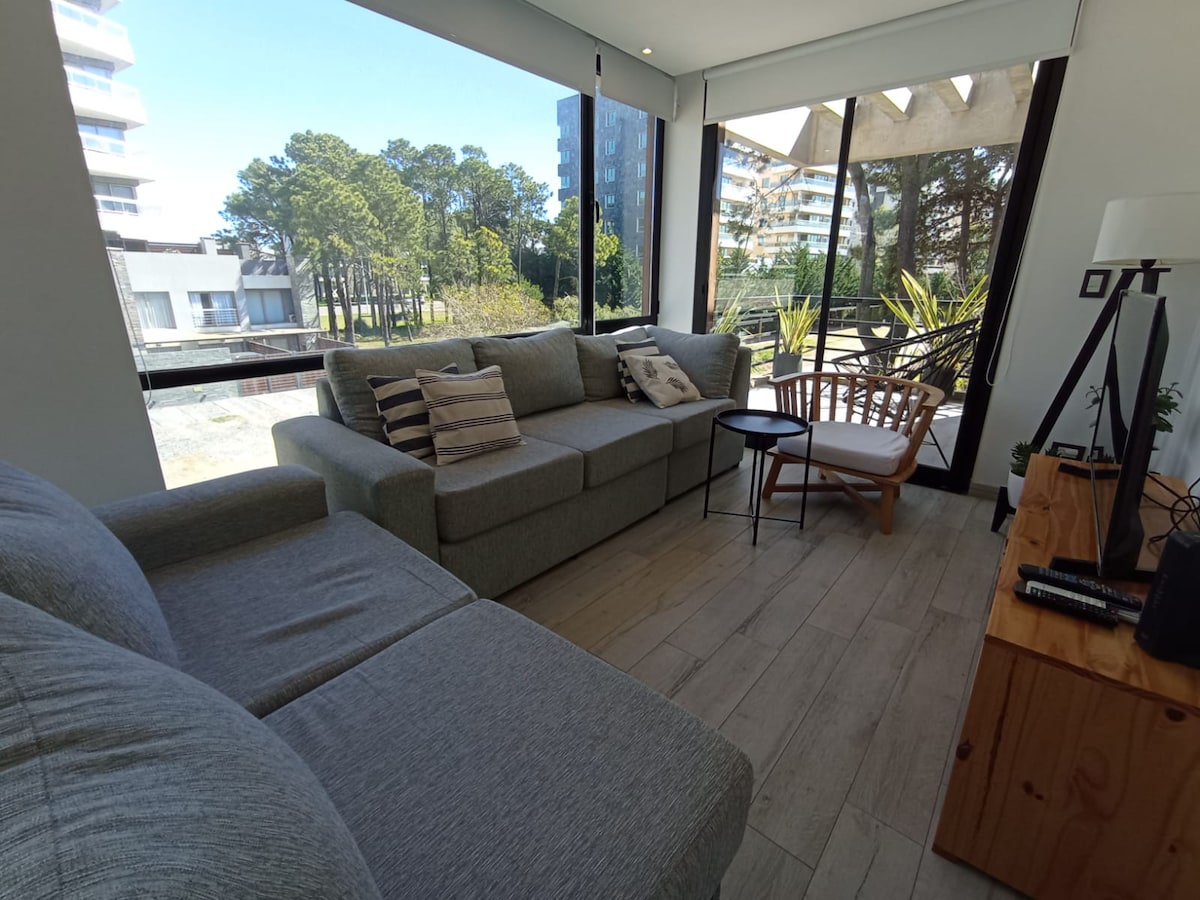 Hermoso departamento de 2 ambientes de 44.35m2 cubiertos y un patio de 36m2, que tiene como vista la pileta del edificio y un pinar divino. Cuenta con una cochera cubierta grande para camioneta. Un lugar que mezcla la naturaleza, la comodidad y el confort. Cuenta con un baño completo, un dormitorio, un living con cocina incorporada (heladera, microondas, horno) y un sillón que se hace cama doble o pueden ser 2 camas individuales. Tiene parrilla propia y techada.
