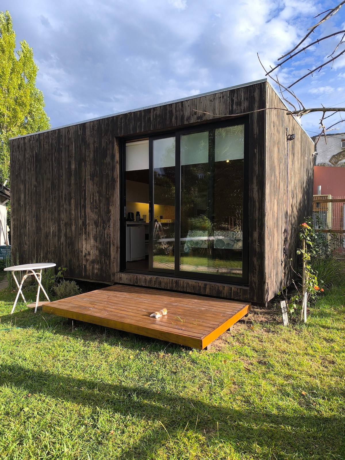 Increíble Micro Casa de Concreto en pleno bosque, respetando la naturaleza del lugar, únicoambiente con una cama queen, mesa escritorio, 2 sillas y WiFi. Baño con ducha, lavamanos, inodoro. Kitchenette con bacha, pava eléctrica, microondas y heladera con freezer, NO está para cocinar. Muy iluminada con el mar a 700m y el centro comercial a 600m. Esta hermosa casa está escondida detrás de la casa principal con total privacidad y autonomía. Asador exterior para uso común del lugar. Bienvenidos!