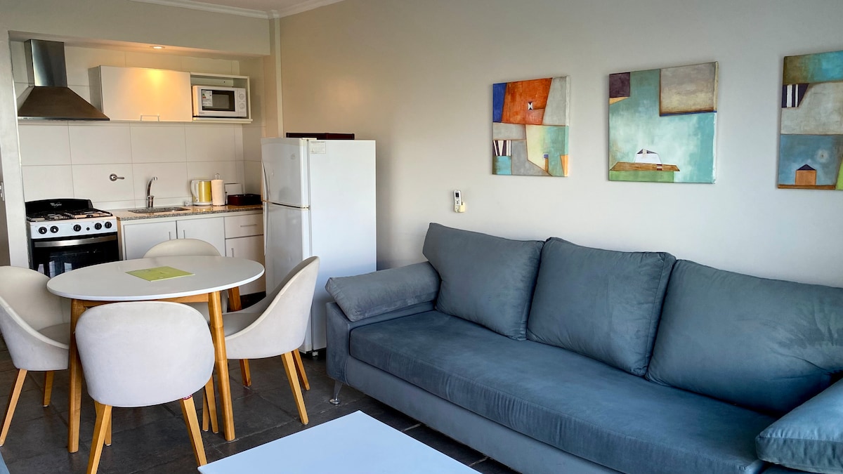 Departamento monoambiente con terraza privada de 20 m² y vista plena al mar. Sommier matrimonial, sillón cama. Tv Led 43" Smart, cable, canales HD, pack Futbol. Comedor diario y cocina con anafe, heladera, microondas, vajilla completa, tostadora, pava eléctrica. Baño completo, secador cabellos, blancos y amenities. Internet WIFI antena propia. Caja seguridad. Aire acondicionado, calefacción por losa radiante.