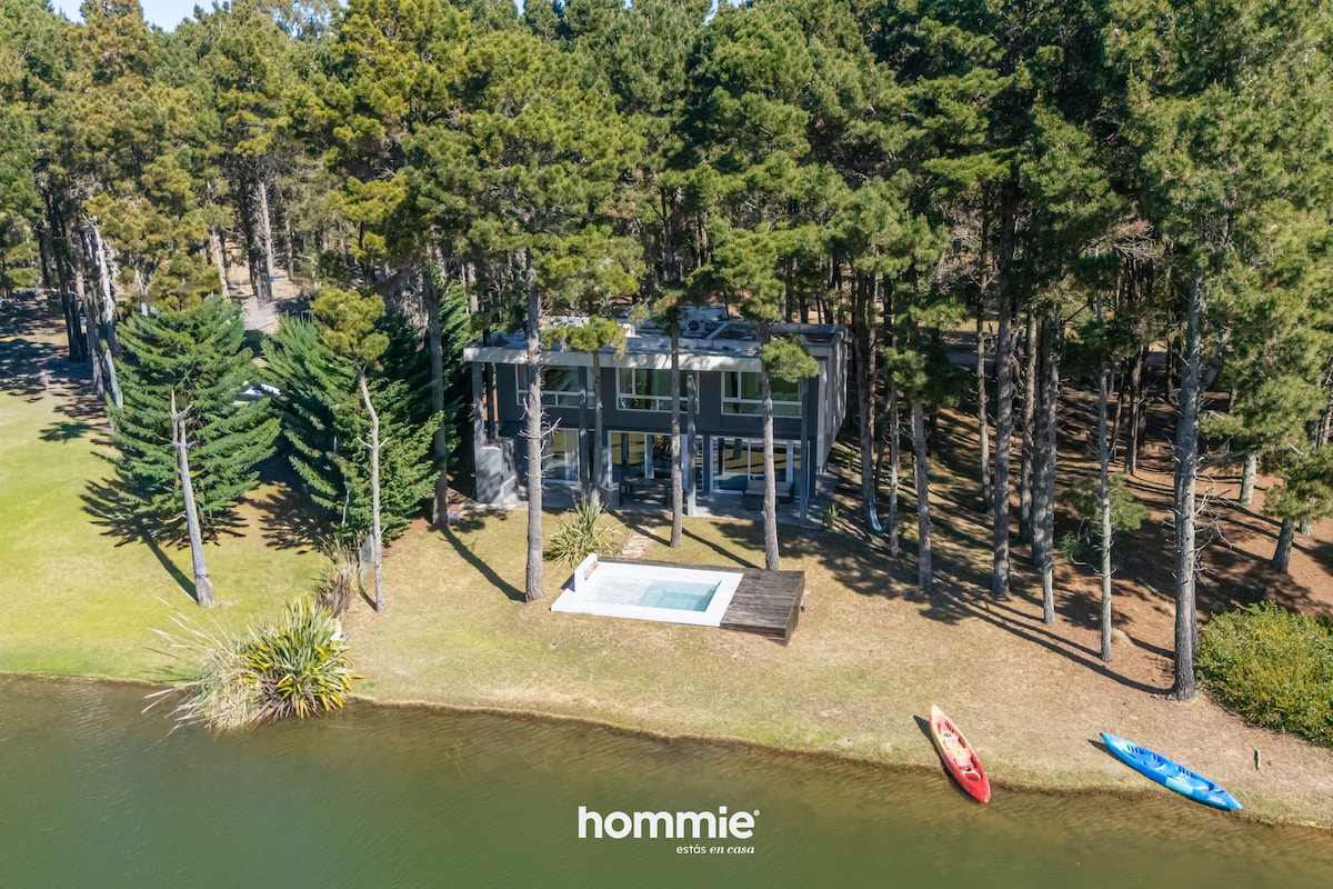 Casa amplia y luminosa ubicada sobre la laguna del Barrio 2 de Villa Robles. En planta baja cuenta con cocina, living y comedor integrados con vista abierta a la laguna, toilette de recepción y un dormitorio con baño completo. En planta alta dispone de tres dormitorios, uno en suite, uno con cama matrimonial y otro con dos camas individuales, además de un baño completo. Incluye heladera, reposeras y sombrilla. No incluye sábanas, toallas ni repasadores. Somos @behommie