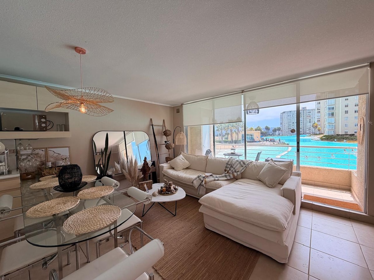 Departamento con vista panorámica. 3 habitaciones, 2 baños, 2 estacionamientos y cocina equipada. Incluye: • Wifi • 2 kayaks • 2 bodyboards • Parrilla Máximo 6 personas. El recinto tiene canchas, juegos, restaurantes y una de las piscinas más grandes del mundo para navegar y practicar deportes acuáticos. Piscinas para baño disponibles: • Fines de semana (31/10-08/12). • Todos los días (14/12-15/03). • Festivos todo el año. Piscinas temperadas y jacuzzi exclusivos para propietarios.