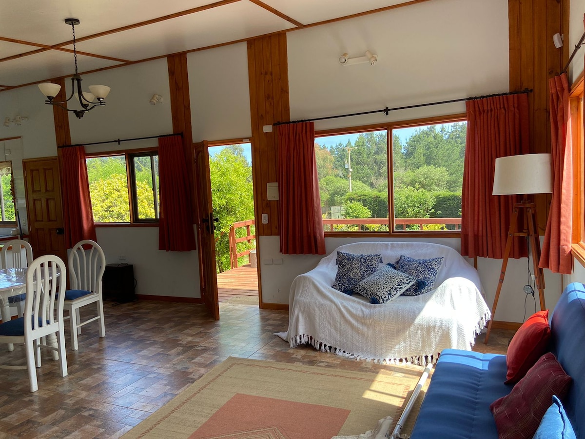 Linda y acogedora parcela en Algarrobo a 5 minutos en auto de la playa, a 15 minutos caminando. Lugar tranquilo y natural. La cabaña principal tiene living y comedor, Bosca, smartTV, wifi, cocina integrada con lavadora . Dos dormitorios y un baño completo. Hay cabañita exterior con dos dormitorios unidos y baño completo. La parcela tiene piscina en deck, quincho para asado con guirnalda de luces, juegos infantiles, casa en un arbol. Tiene bajada a la quebrada. uso exclusivo.