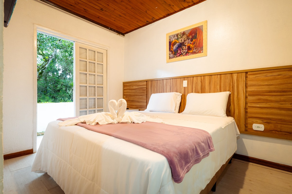 Este quarto para casal oferece muito conforto e uma ótima localização a menos de 5 minutos da Vila Capivari, centro turístico de Campos do Jordão. Apenas a observação de que o acesso aos quartos possui escadas, não sendo recomendada para pessoas com mobilidade reduzida.