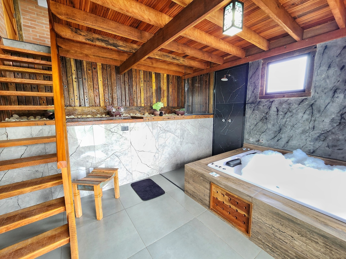 JACUZI DE IMERSÃO! cabana une charme rústico e conforto moderno, oferecendo uma estadia única. No térreo, cozinha, sala de jantar e estar integradas são perfeitas para criar memórias. Uma escada leva até as 3 suítes, todas equipadas para o máximo conforto. As suítes são disponibilizadas conforme o número de hóspedes, mantendo as não utilizadas fechadas para garantir organização. Ideal para viagens românticas, este é o lugar ideal para se desconectar da rotina.