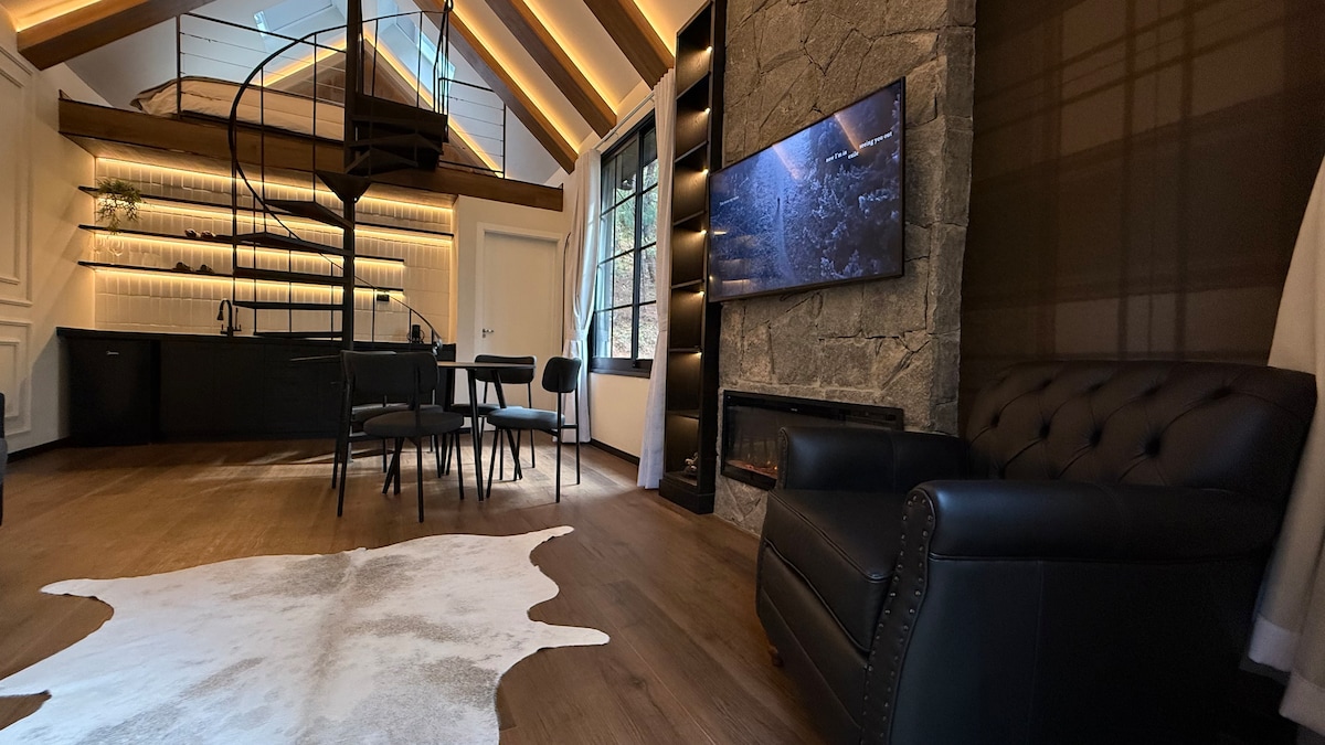 Uma verdadeira cabana americana! Na Farm House, o mezanino com cama queen é acessado por uma charmosa escada caracol e conta com amplas claraboias para dormir sob as estrelas (ou fechá-las para um clima mais aconchegante). A cabana oferece cozinha completa para sua estadia e área externa com firepit. Lá fora, um ofurô de madeira com água quentinha. O banheiro fica na parte traseira da casa, com box voltado para o bosque e um paisagismo pensado para garantir total privacidade nessa experiência.