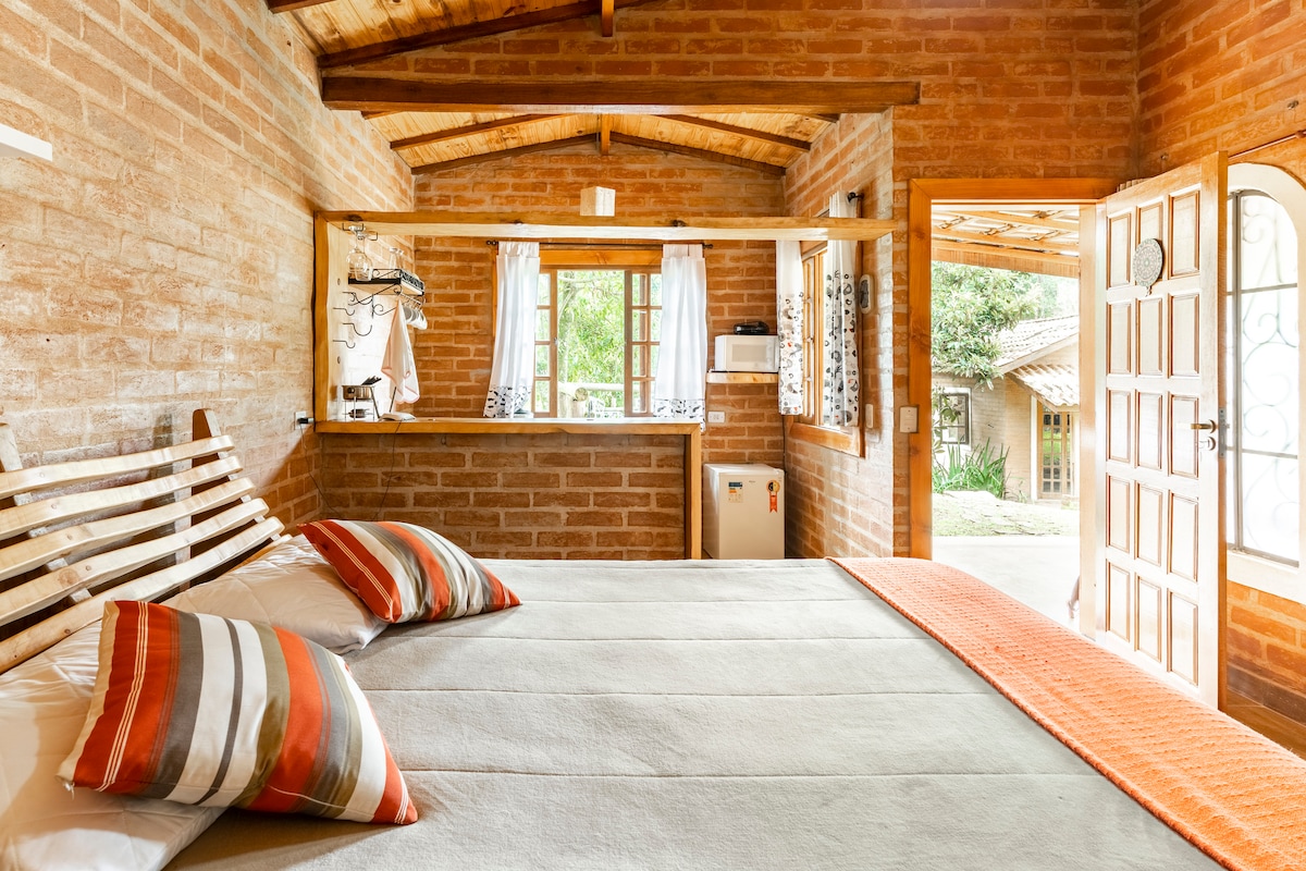 Do lado de fora, natureza exuberante, trilha, cachoeira, piscina de água de nascente, churrasqueira, fogueira. Dentro, lareira, cama king com cobertores maravilhosos, Wi-Fi potente, Smart TV 40" e cozinha equipada. A área externa e Jacuzzi compartilhada com outros 3 chalés. Reservar horário. É possível interagir com os animais (cachorros, gatos, galinhas, patos). Pode-se encomendar com antecedência café da manhã. Oferecemos terapias (massagens, tarô, Soundhealing)