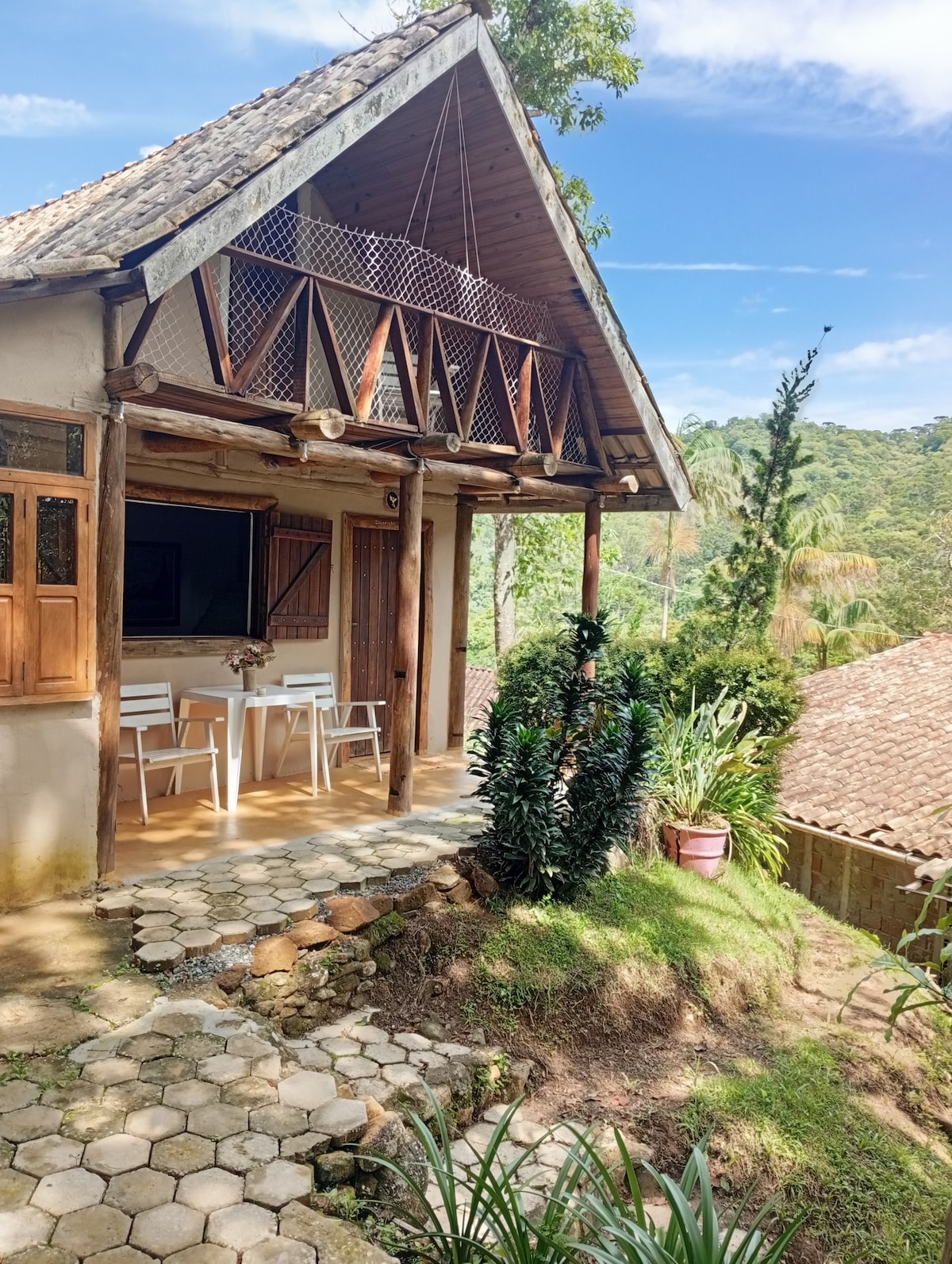 Pensa em uma cabana num Jardim. Com charme, aconchego..e um amor! Sim, esse lugar é aqui e o amor você pode trazer. A cabana é de madeira, lareira de pedra. Aquece e proporciona uma noite romântica, experiência incrível! Taças para vinho e aparelho de fondue estão aqui para isso. Espreguiçadeiras no sol, pequeno deque e um recanto com rede e balanço no jardim. Estamos em meio à natureza e muito perto do agito do centrinho é só escolher!