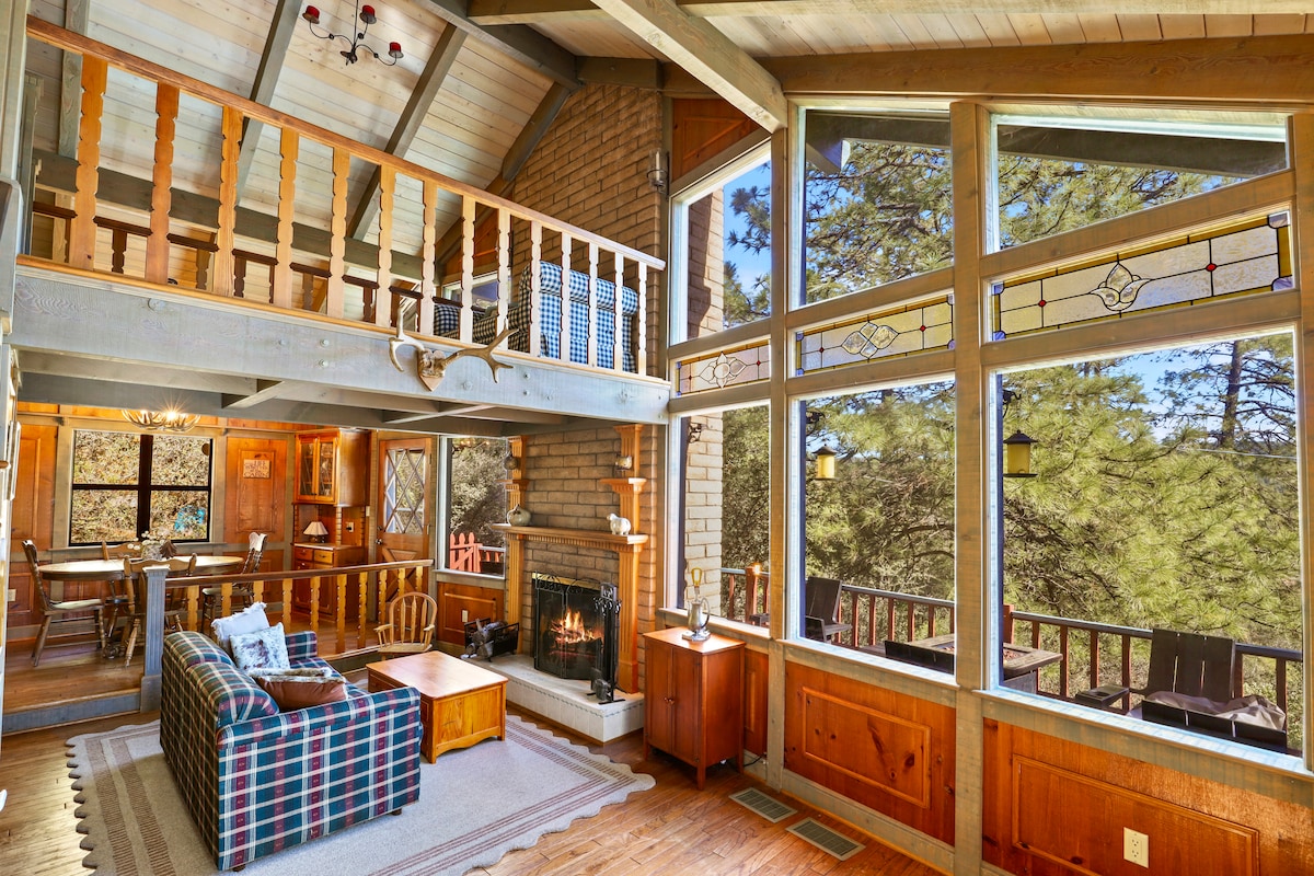 Escape city life in this cozy mountain cabin in the Tonto National Forest. Its wrap-around double deck overlooking the Mogollon Rim is great for watching sunrises, sunsets, wildlife, and stargazing. There are 2 bedrooms with queen beds (one has an ensuite bathroom), and there's a murphy bed in the library. The library has a large workspace with two desks. The cabin is the perfect base for relaxing, hiking, working remotely, visiting Fossil Creek, Tonto Natural Bridge and so much more!l