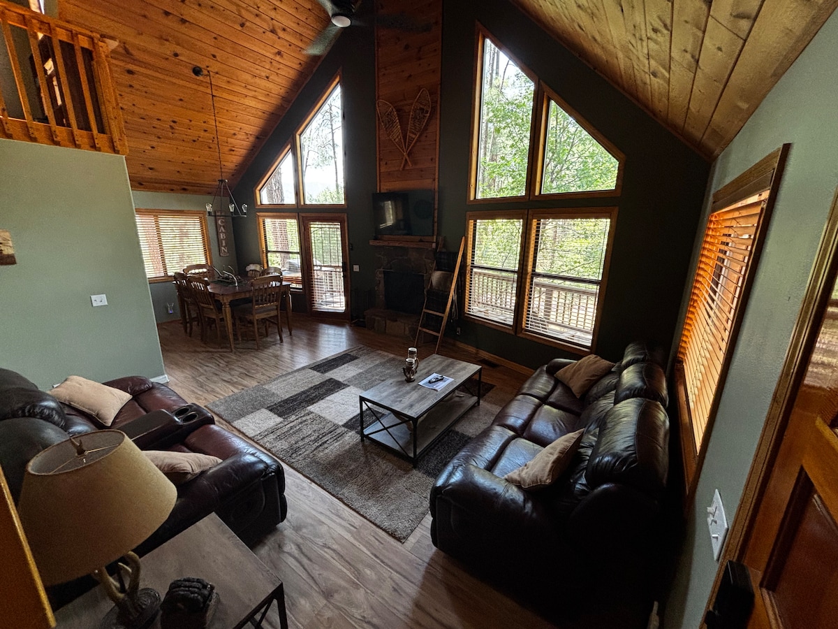 You won't be roughing it when you stay at our charming rock covered chalet located on two acres with fabulous views. Enjoy the new custom kitchen with quartz counter tops and new soft close cabinetry. There is a jetted tub in the bathroom and a hot tub on the deck to recover from scenic hikes in the area.. There is a short trail to the river for swimming, fishing, hiking and picnicking. Whether it be for fun, adventure or romance...you can find it here.