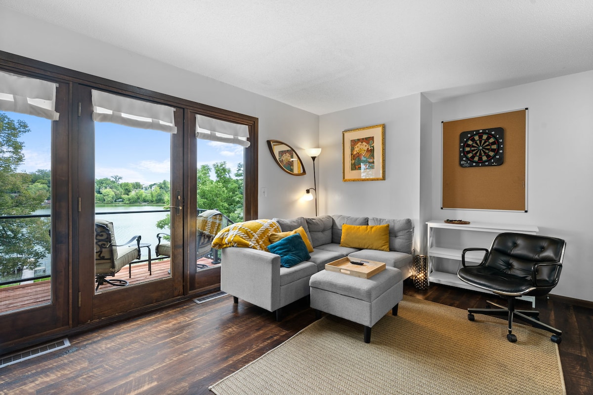 Enjoy lake life walking distance to restaurants, bars, parks, & shopping! Outdoor grounds are part of an HOA. Lower patio with grill is shared with another unit just below this one. HOA requires liability waiver for all adults (Find in the "House Manual" to pre-read). 1 dog under 30lbs ok w/$150 pet fee. Sandy bottom lake, but seaweed grows where shallow. The laundry room has a desk & 2 fold out chair beds. Ask about longer term stays. Great deals for the off season!