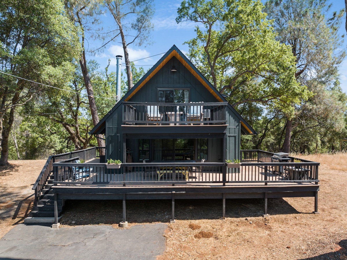 Nestled in evergreens, our rustic lakefront cabin boasts high ceilings and skylights and comes equipped with ductless heating and cooling. Barbecue and dine on the back deck while looking over the lake, hop in the lake right from our private dock, take a beautiful drive over to Yosemite or check out the iconic gold rush town, Columbia. This is perfect for the explorers in the family or the people that just want to relax and enjoy the lakefront life.