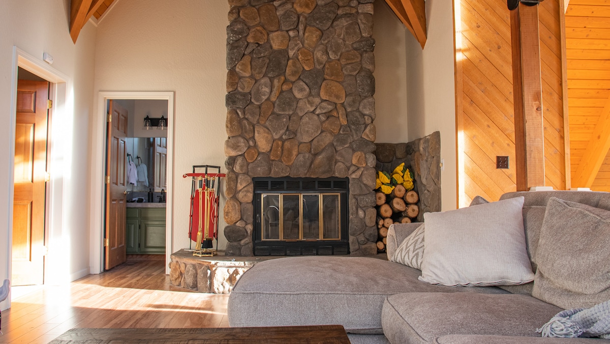 *GORGEOUS 2,600 sq ft custom 3 level CHALET IN BLUE LAKE SPRINGS* *BRIGHT, OPEN floor plan, 21' vaulted ceilings, FOREST VIEWS; AC/HEAT* *LARGE DECK 1,000+ sq ft w/ BBQ, 2 fire pits & comfortable seating* *Full-stocked CHEF'S KITCHEN* *ROMANTIC MASTER SUITE w/ gas fireplace *KID & BABY FRIENDLY cribs, baby gates, toys *Rec room w/ POOL TABLE, GAMES, 70" SMART TVs *QUIET WALKABLE neighborhood, *5 mins to HIKING TRAILS *Access to PRIVATE LAKE, POOL, REC CENTER