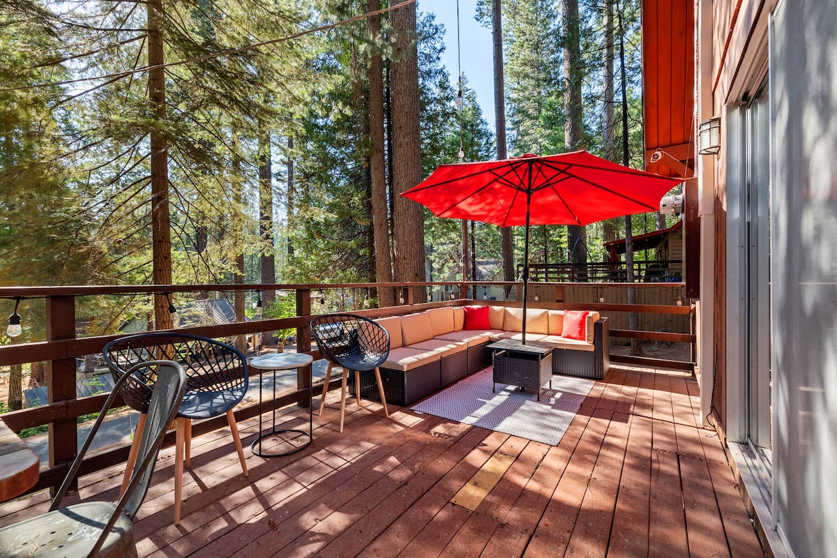 Enjoy an escape to crisp, clean mountain air and a relaxed lifestyle: Mountain Time. Curl up in front of the warm and welcoming fireplace, enjoy cocktails on the large deck, and take advantage of never ending outdoor activities. This three-bedroom, two bath mountain sanctuary is located just above the Stanislaus River in the Sierra Nevada Mountains. Elevation 5,000 feet. The cabin is a short walk from the Old Strawberry bridge and several forest trails.