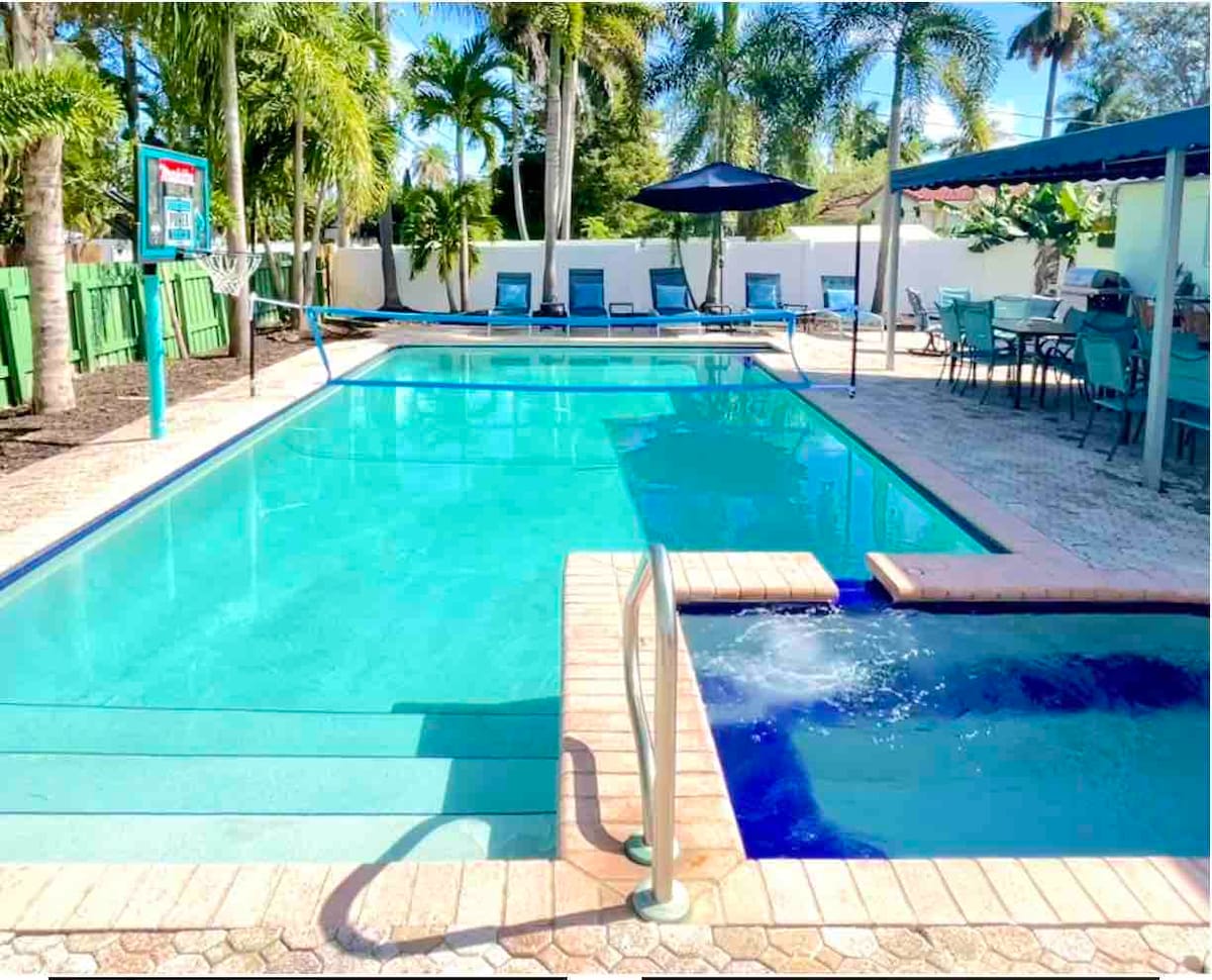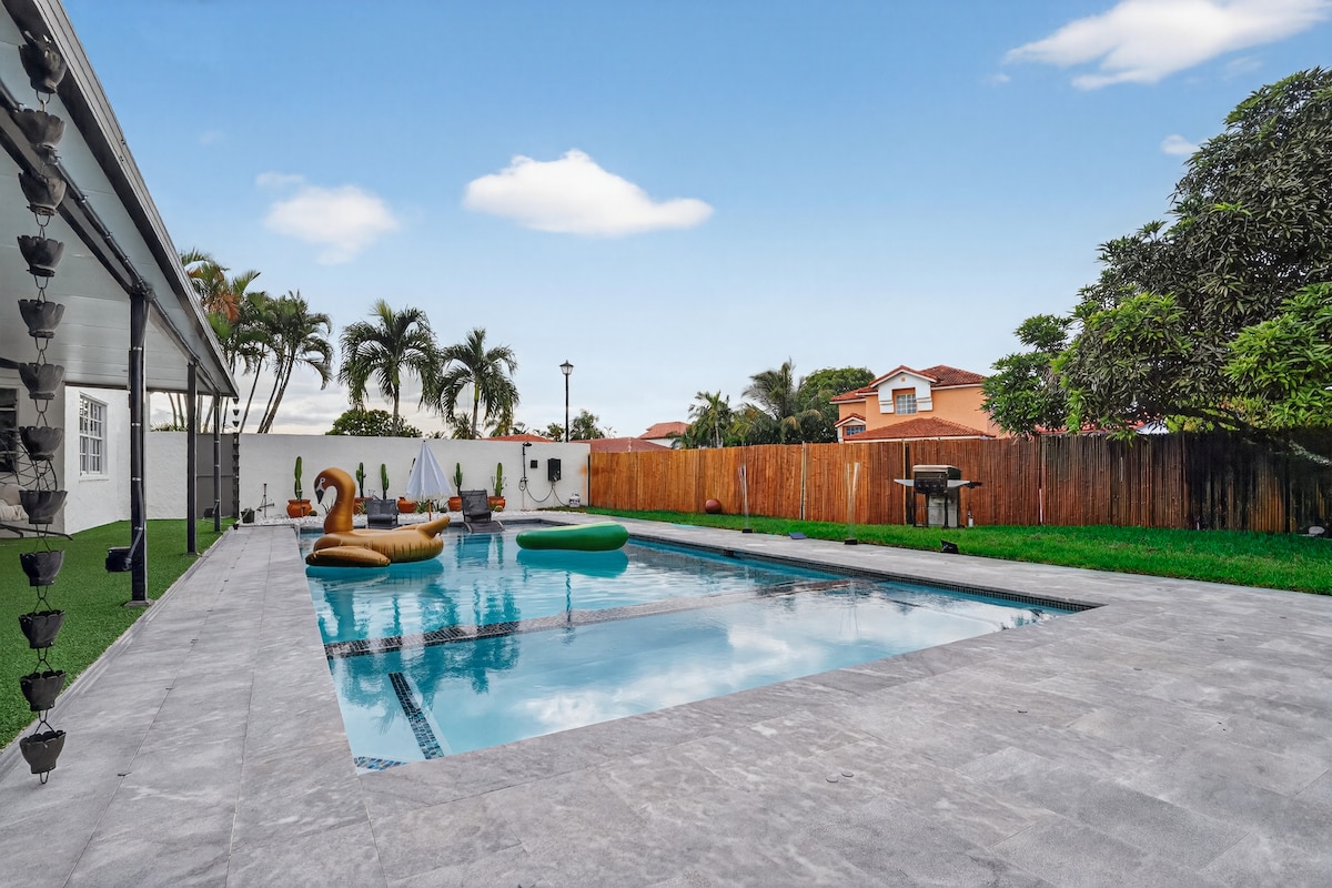 Enjoy this gem in the heart of Miami newly renovated home. This modern chic home is designed to accommodate 13 guest. Perfect for entertaining backyard equipped with a counter top bar, BBQ area, dinning room area and sofa. Layout in the Miami sun in a modern pool or choose nightlife chill in jacuzzi overlooking the stars. For our fishing lovers, this home provides a deck overlooking a lake. This home is close to all main highways, malls, Miami beach, FIU, Brickell, Wynwood, downtown Miami.