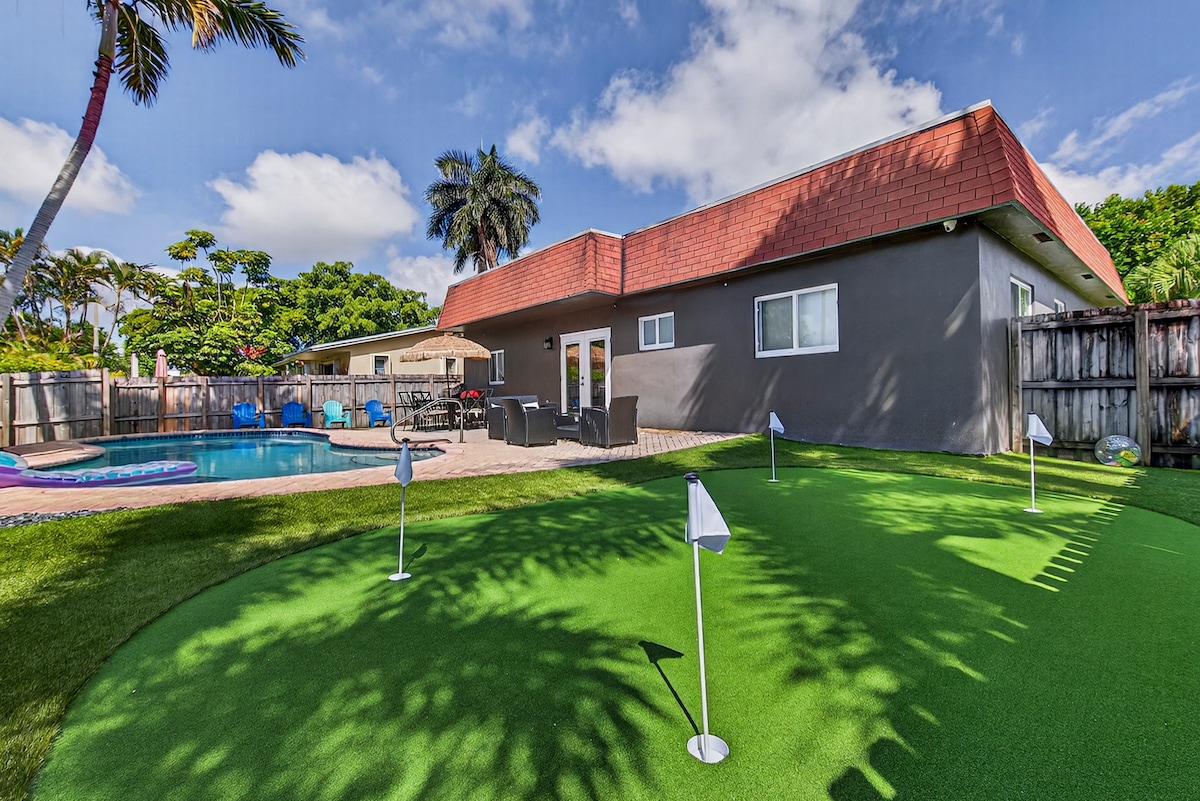 Escape to a unique Miami waterfront retreat where you can kayak from the backyard, unwind in a hot tub, and swim in a pristine Heated Pool. This quiet family-friendly haven offers a chance to spot local wildlife like ducks and tropical birds. Experience a trendy vibe, featuring a mini golf course, cornhole, pool table, multicade play system and so much more. With a clean, spacious interior and a central location near both Miami and Aventura, it’s perfect for a memorable getaway.