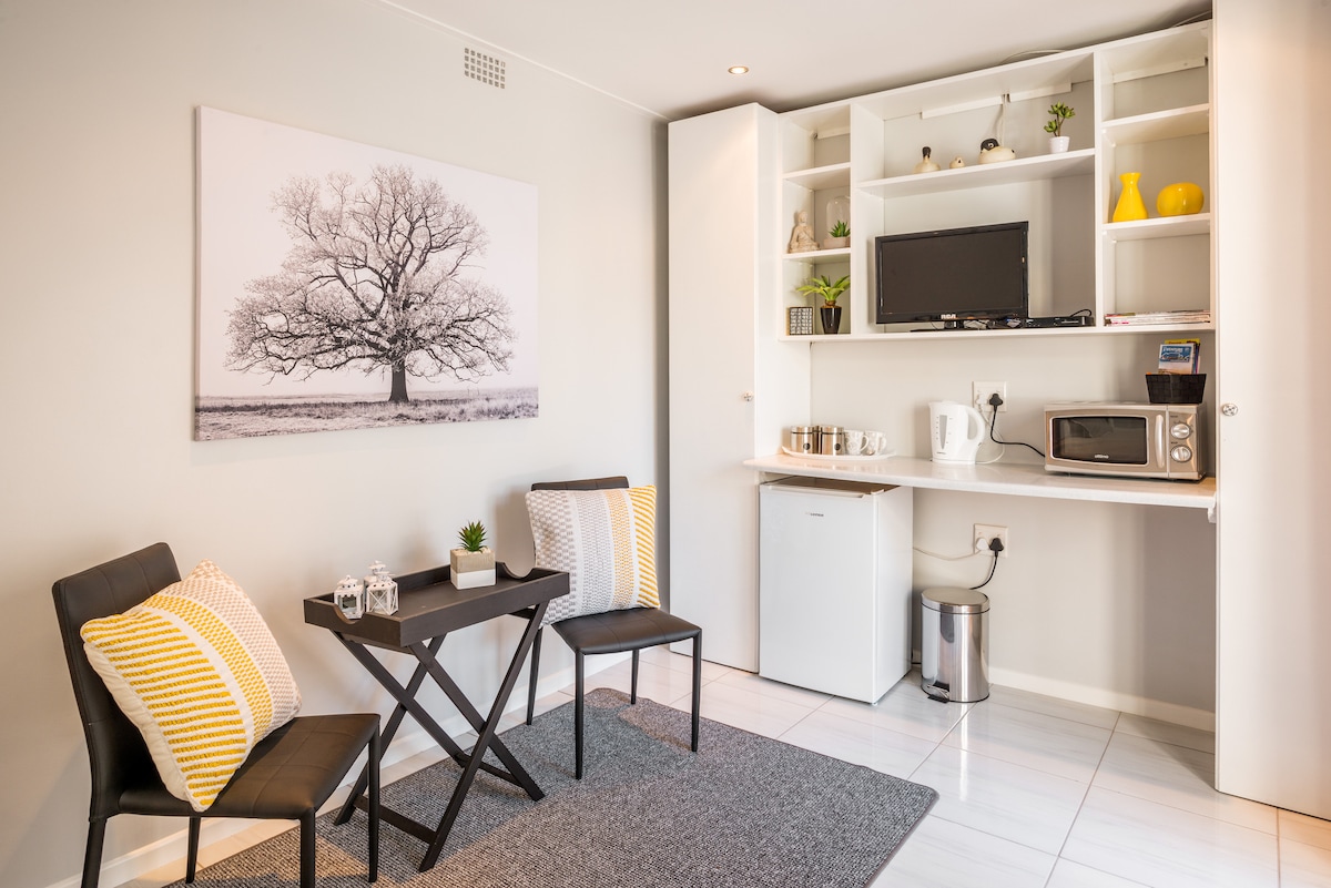 A safe & tastefully furnished space, providing a perfect balance of home comforts & simplicity for a holiday or business stay. Pinelands is a centrally located suburb in Cape Town with easy access to the N1 & N2. 20min from Cape Town International Airport, 15min from the city centre, beaches & the V&A Waterfront, & 10min from UCT & Table Mountain. The studio is close to Old Mutual & Vincent Palotti hospital and walking distance to restaurants, a grocery store, pharmacy & park.