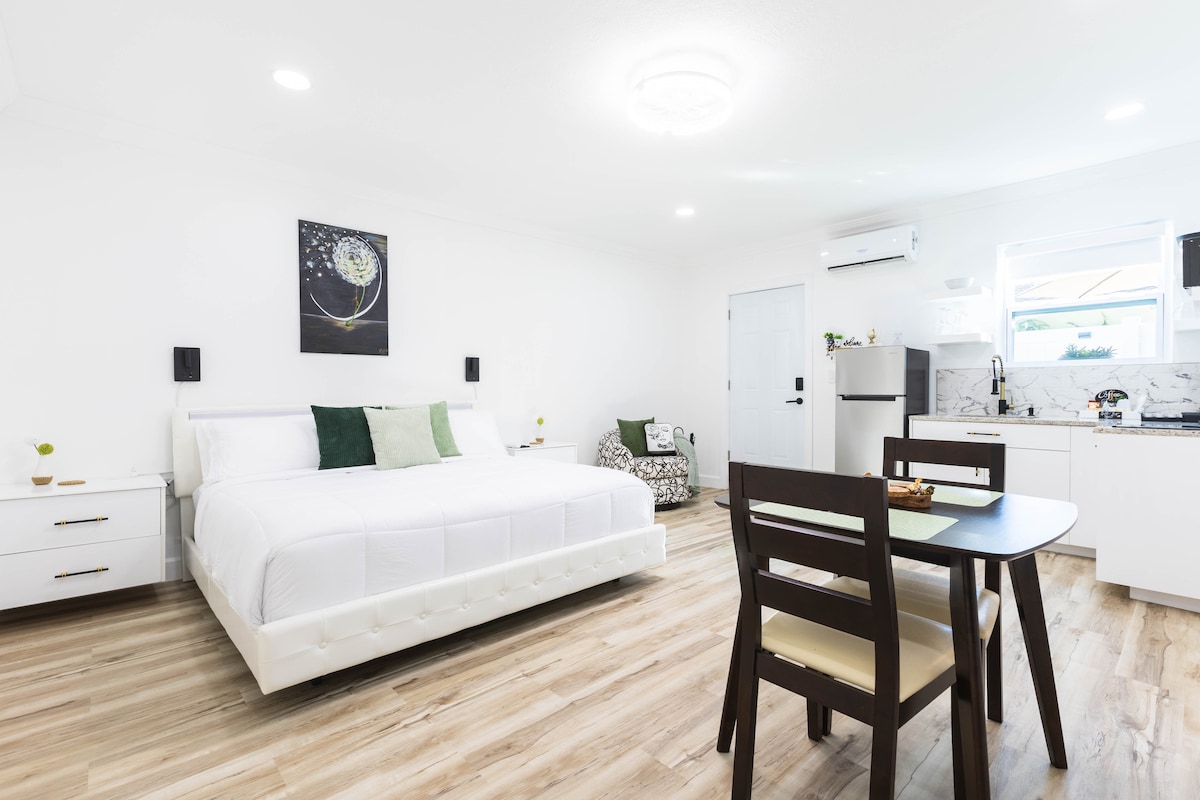 Welcome to our thoughtfully designed studio—small but full of comfort, efficiency, and charm. If your priority is a cozy bed , a truly clean space and location, look no further. Loved by hundreds of wonderful guests, this is one of two private studios in a tiny house, ideal for solo travelers or couples. You’ll have everything you need, plus access to a beautiful shared gazebo with seating, dining areas, and lush greenery. We have a team of four Superhosts, available to help. 🌴☀️🏖️