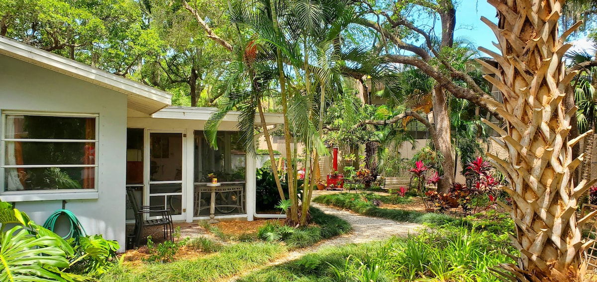 Escape to our tranquil tropical paradise! Our private garden overflows with emerald palm trees, exotic foliage and native blooms, while the covered patio offers a place to relax and savor nature's natural sounds. Grill area, outdoor seating, lounge chairs. 5 minutes to Indian Rocks Beach and downtown amenities. Embark on bike rides on the nearby Pinellas Trail and Tailor Park with our complimentary bikes. Enjoy fun and fishing with our provided kayaks and gear, easily loaded onto your car.
